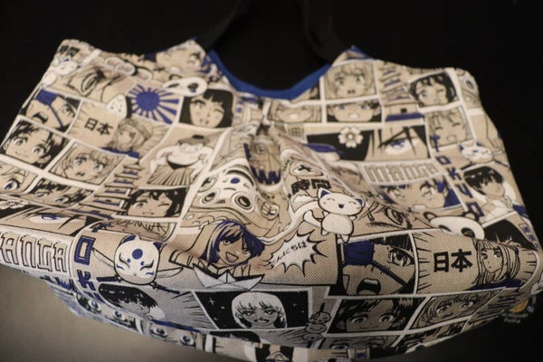 Magnifique sac cabas impression Manga couleur bleue, doublé d'un coton uni bleu avec une poche intérieure pour y glisser vos clefs par exemple. Anses coulissantes noires.
