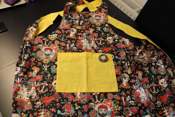 Joli tablier japonais réversible avec un tissu en coton imprimé motifs marins et pirates et un coton uni jaune.