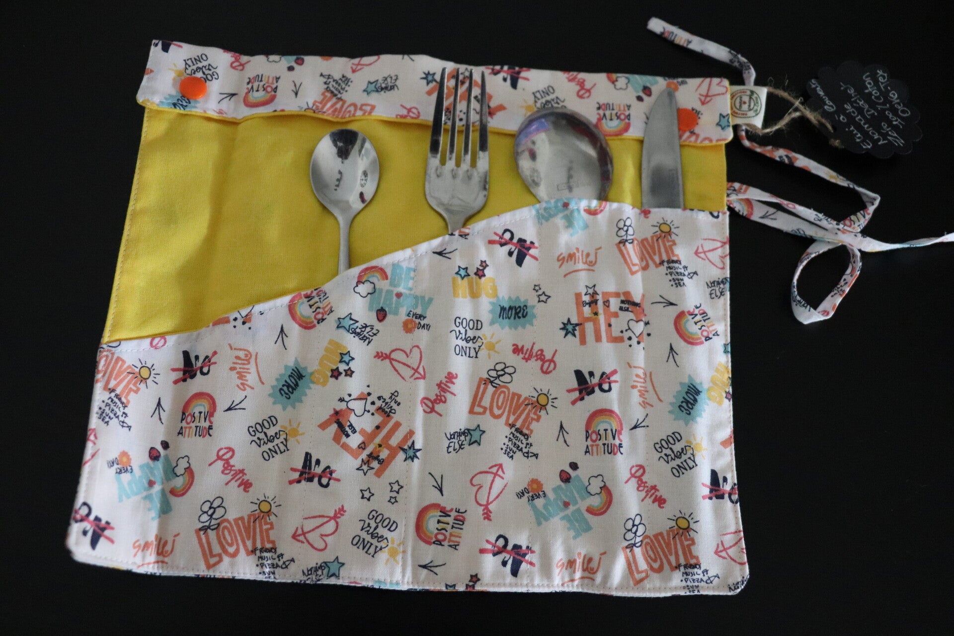 Trés joli tissu blans en coton Oeko-tex avec des grafitis, doublé d'un coton uni jaune.