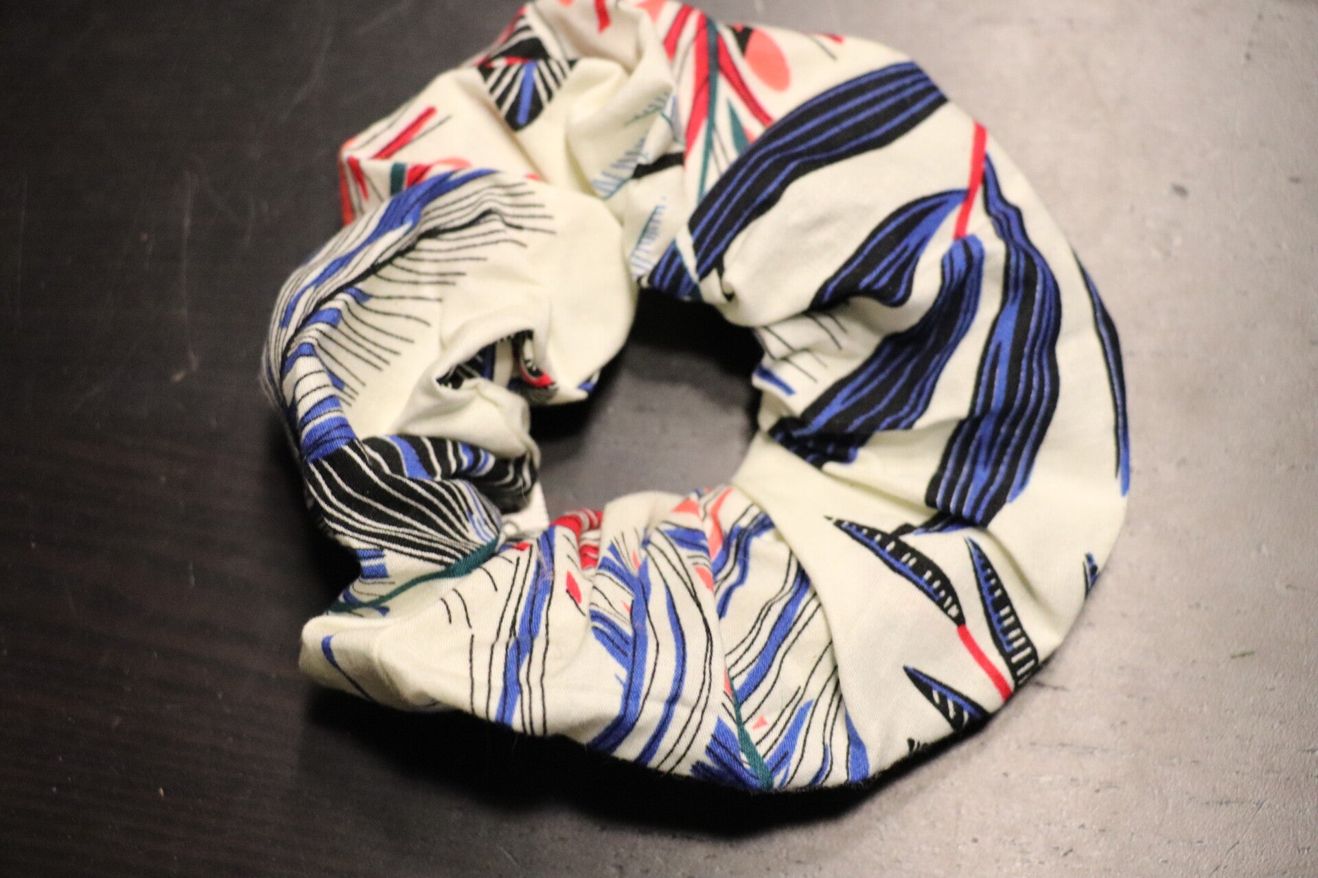 Trés joli tissu blanc avec de grandes feuilles bleues et roses.