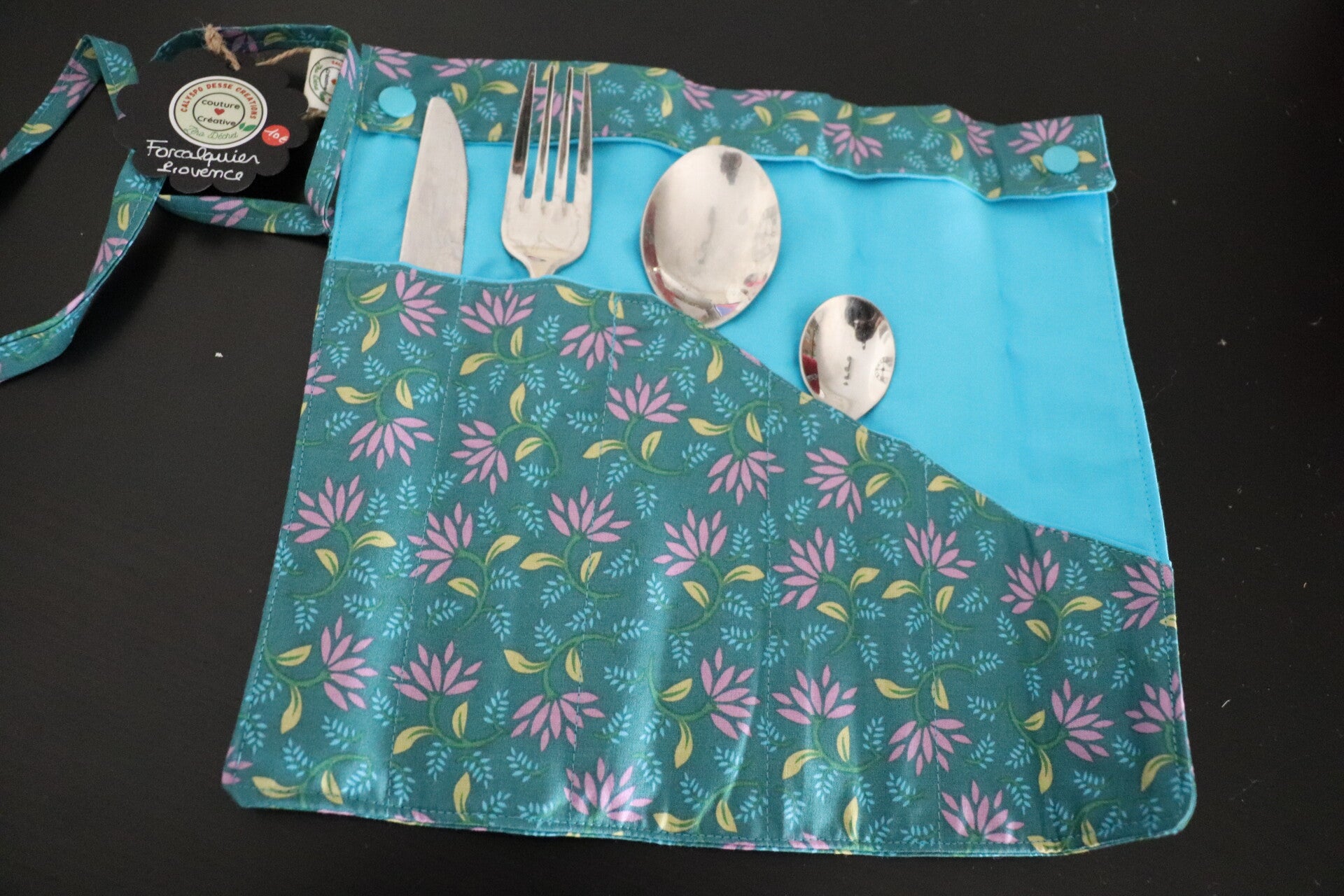 Trés joli tissu vert en coton Oeko-tex, doublé d'un coton uni turquoise.