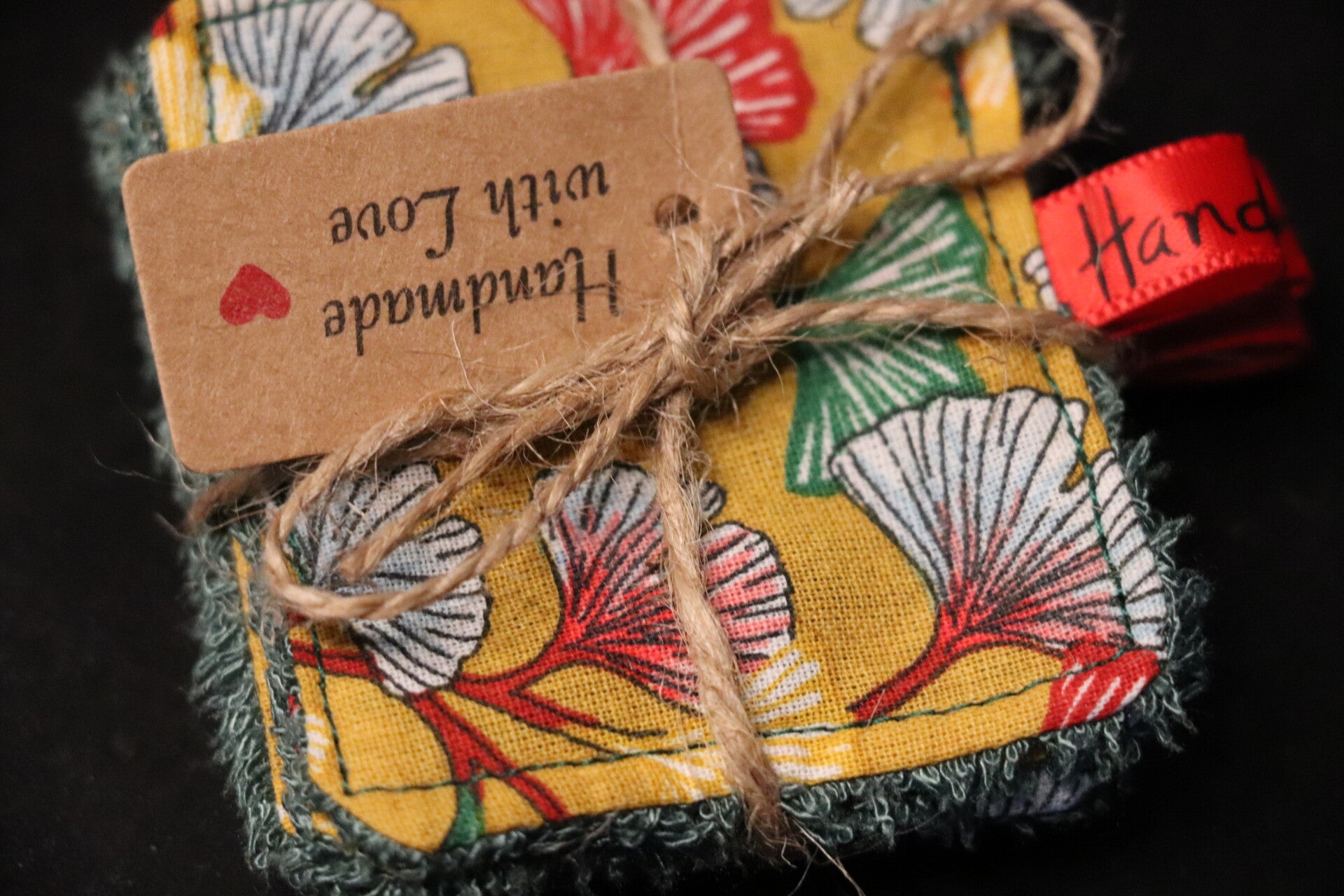 Joli tissu safran avec des fleurs de Ginko doublé d'une éponge de bambou verte ultra douce.
