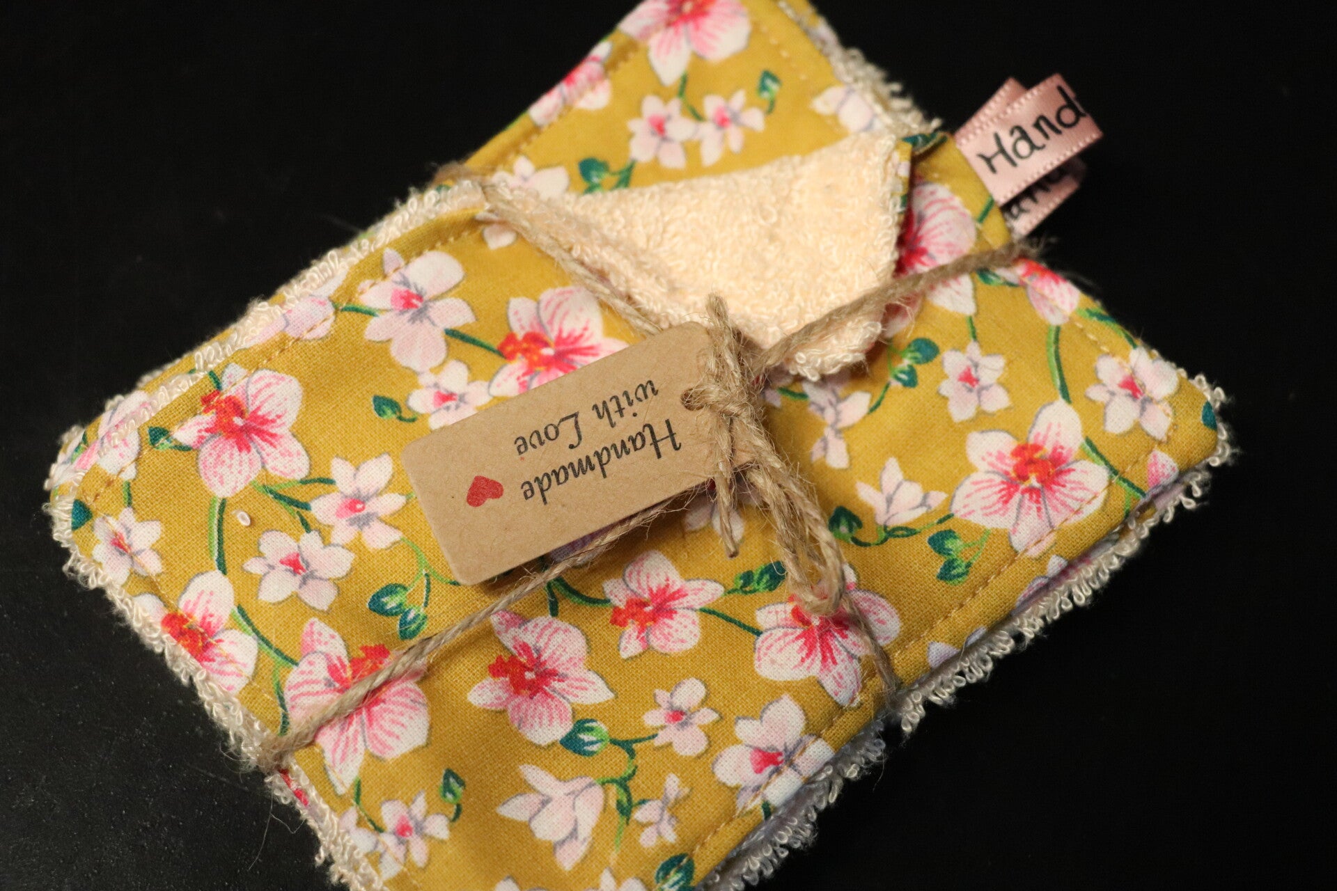 Trés joli tissu en coton jaune safran fleuri doublé d'une éponge de bambou orange clair ultra douce.