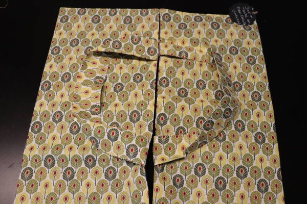 Joli sac à tarte en tissu japonais dans les tons jaune et vert, doublé avec un coton uni noir.