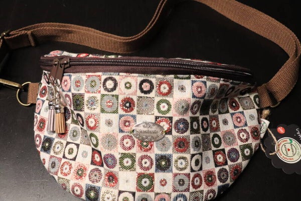 Magnifique sac Banane réalisé dans un tissu Jacquard multicolore et brillant.