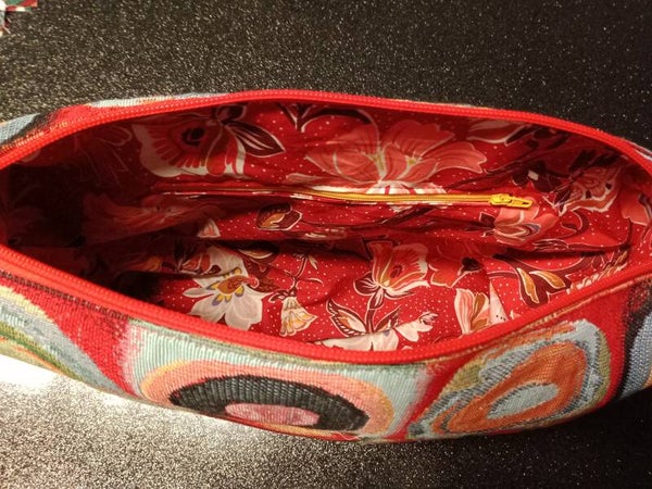 Très jolis sacs Toumou réalisés dans un tissu Jacquard français aux couleurs chatoyantes . Il est doublé dans un coton imprimé floral dans les tons écarlates, le Zip est rouge.