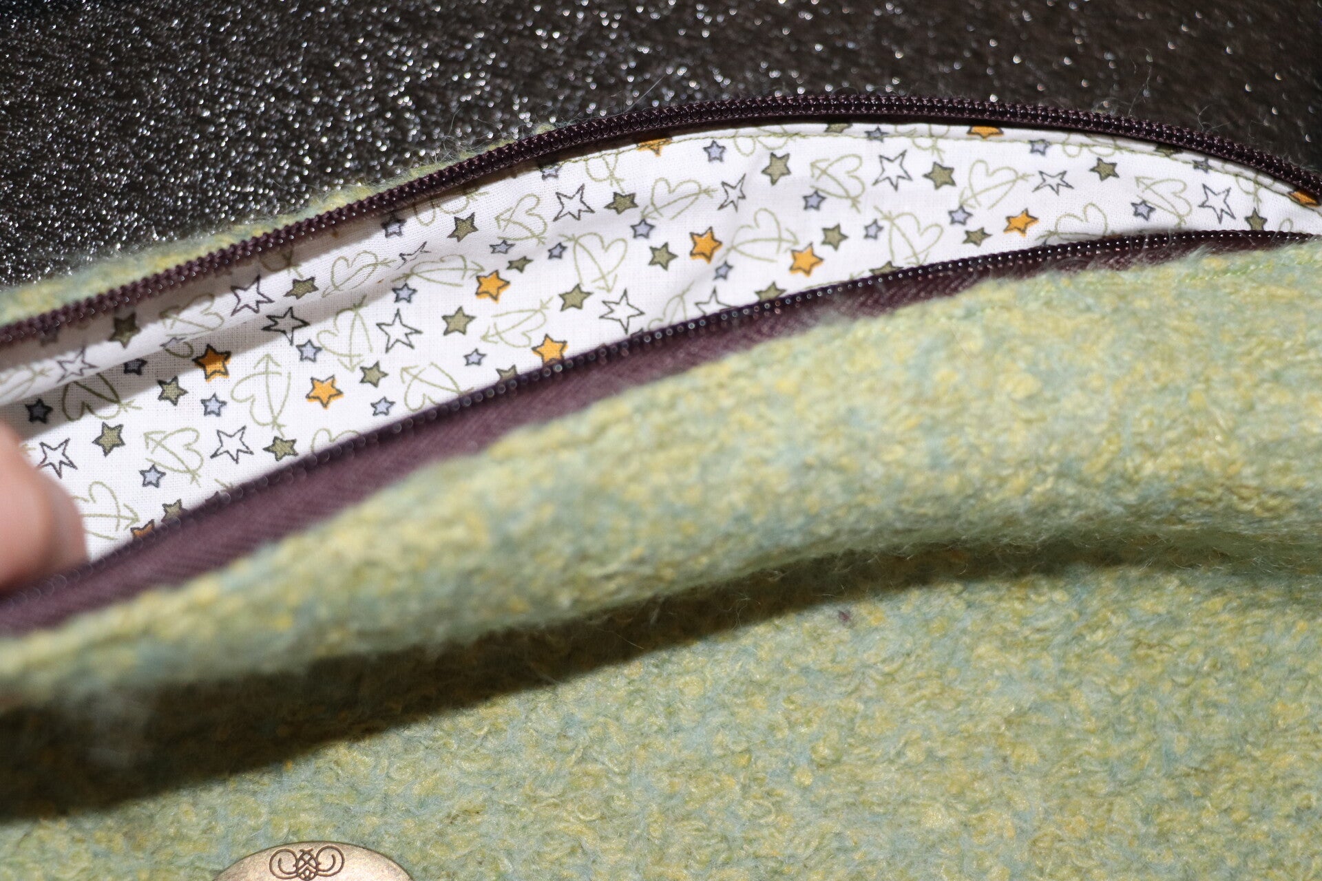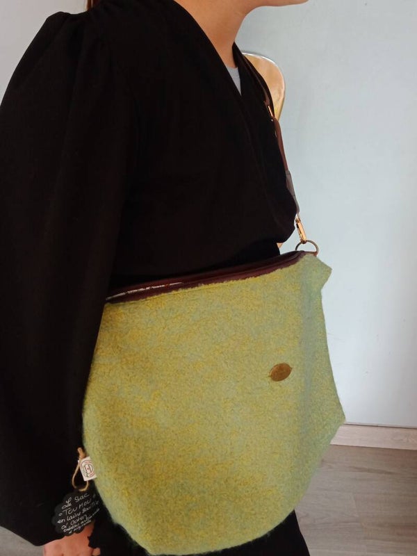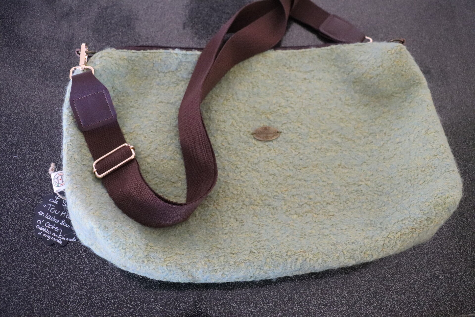 Très joli sac Toumou réalisé dans de la laine bouille . Il est doublé dans un coton imprimé blanc avec des étoiles. La sangle est marron et le Zip aussi.