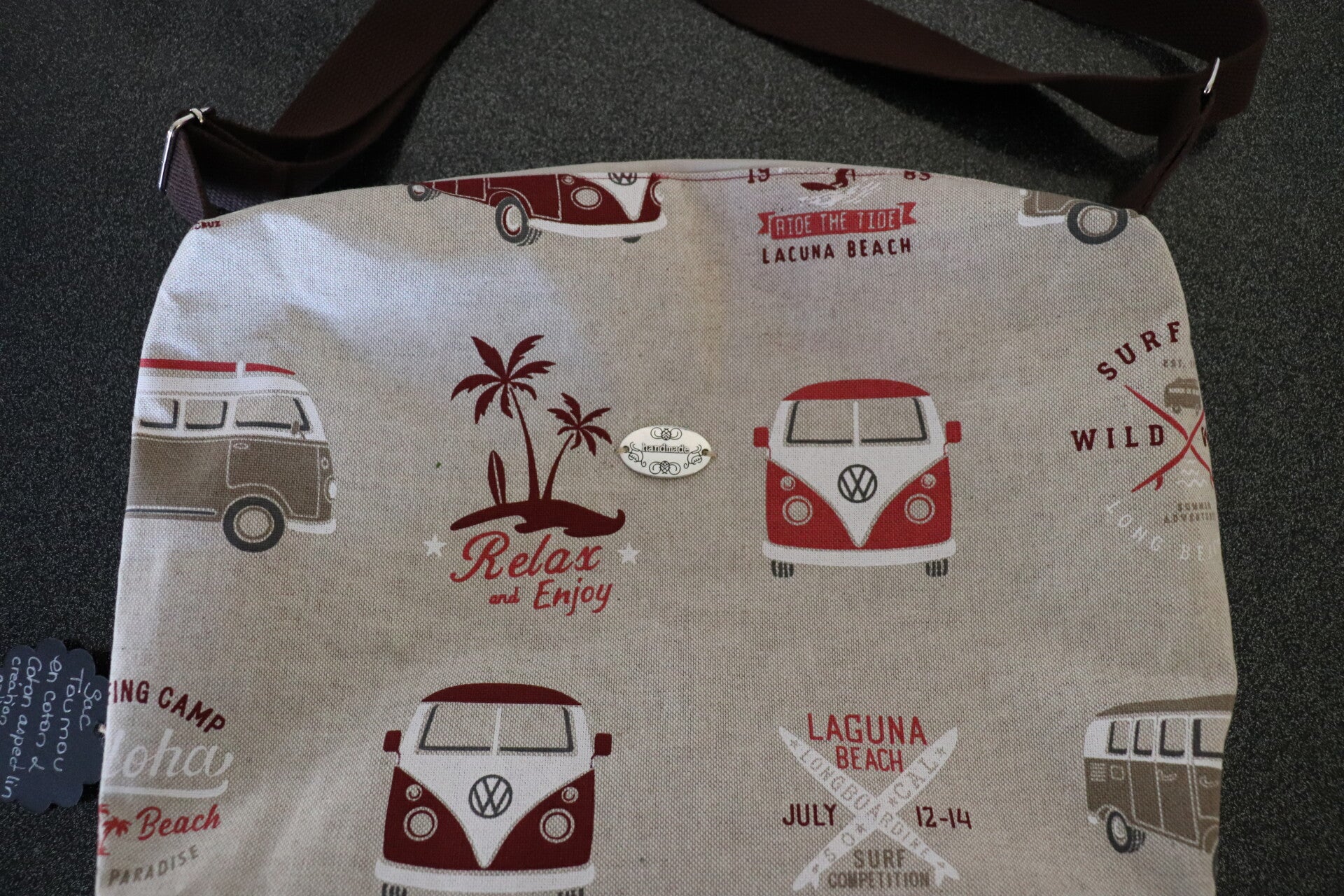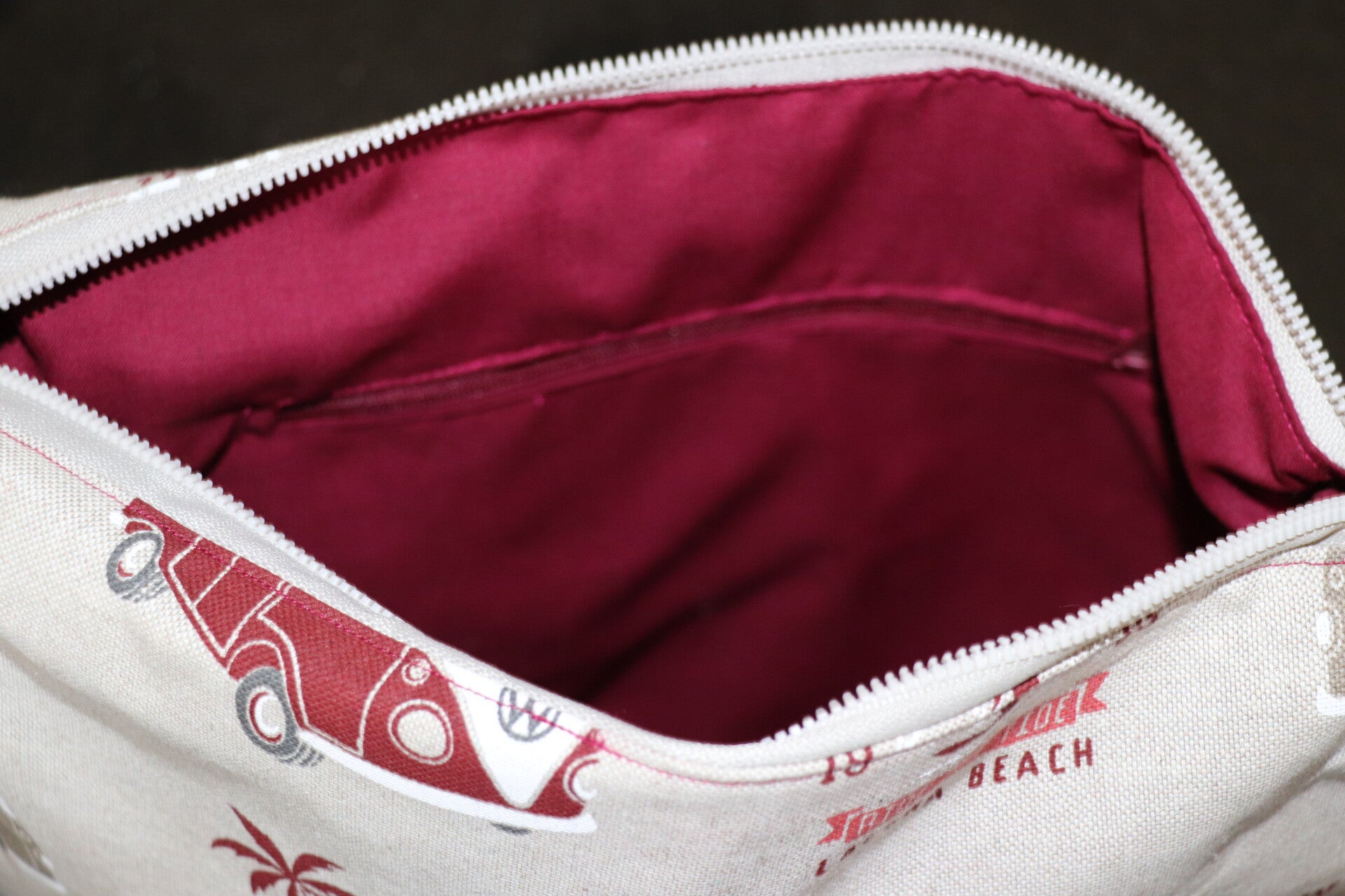 Très joli sac Toumou réalisé dans un tissu en coton aspect lin aux couleurs claires, motif van . Il est doublé dans un coton uni bordeaux, la sangle est marron et le Zip est beige.