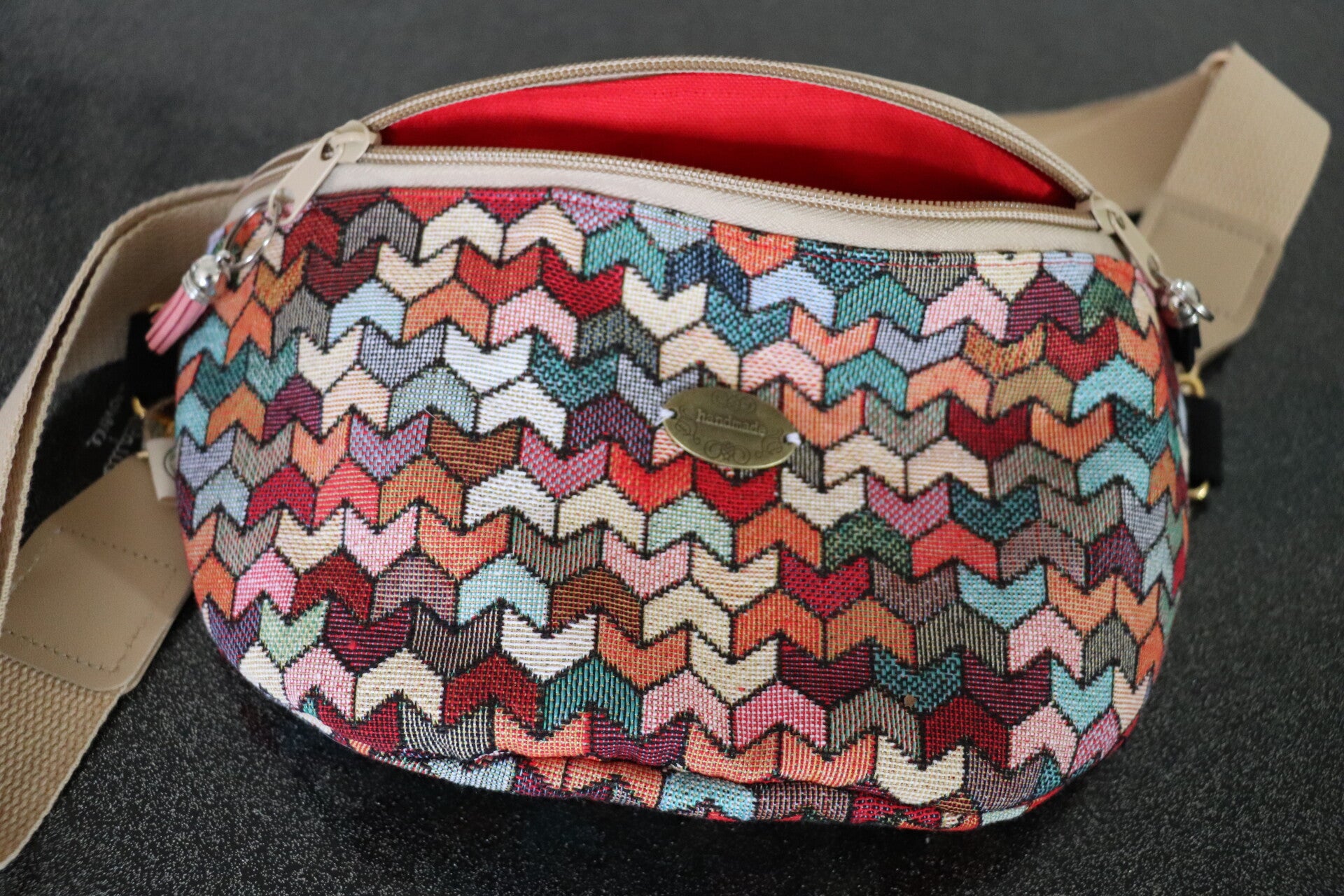 Magnifique sac Banane réalisé dans un tissu Jacquard motif chevrons colorés.