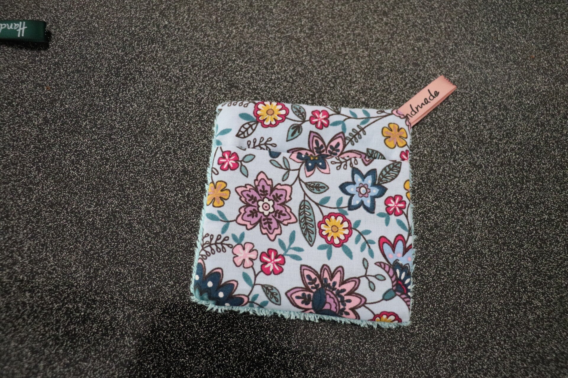 Composition : une face en coton imprimé avec un revers pour y glisser les doigts et une autre face en éponge de bambou bio.