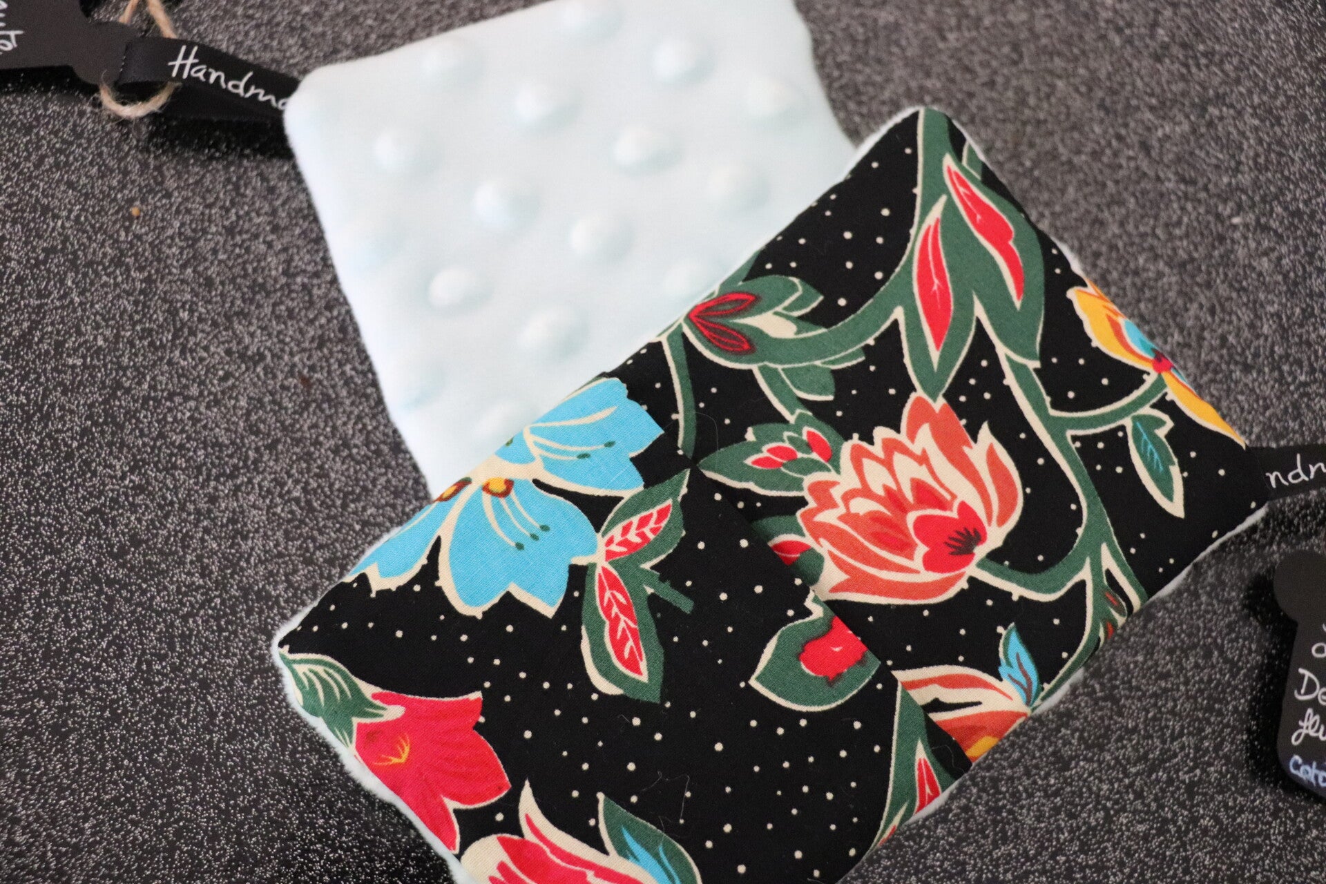 Gant magique fluffy réalisé dans un minky vert et un joli tissu noir imprimé.