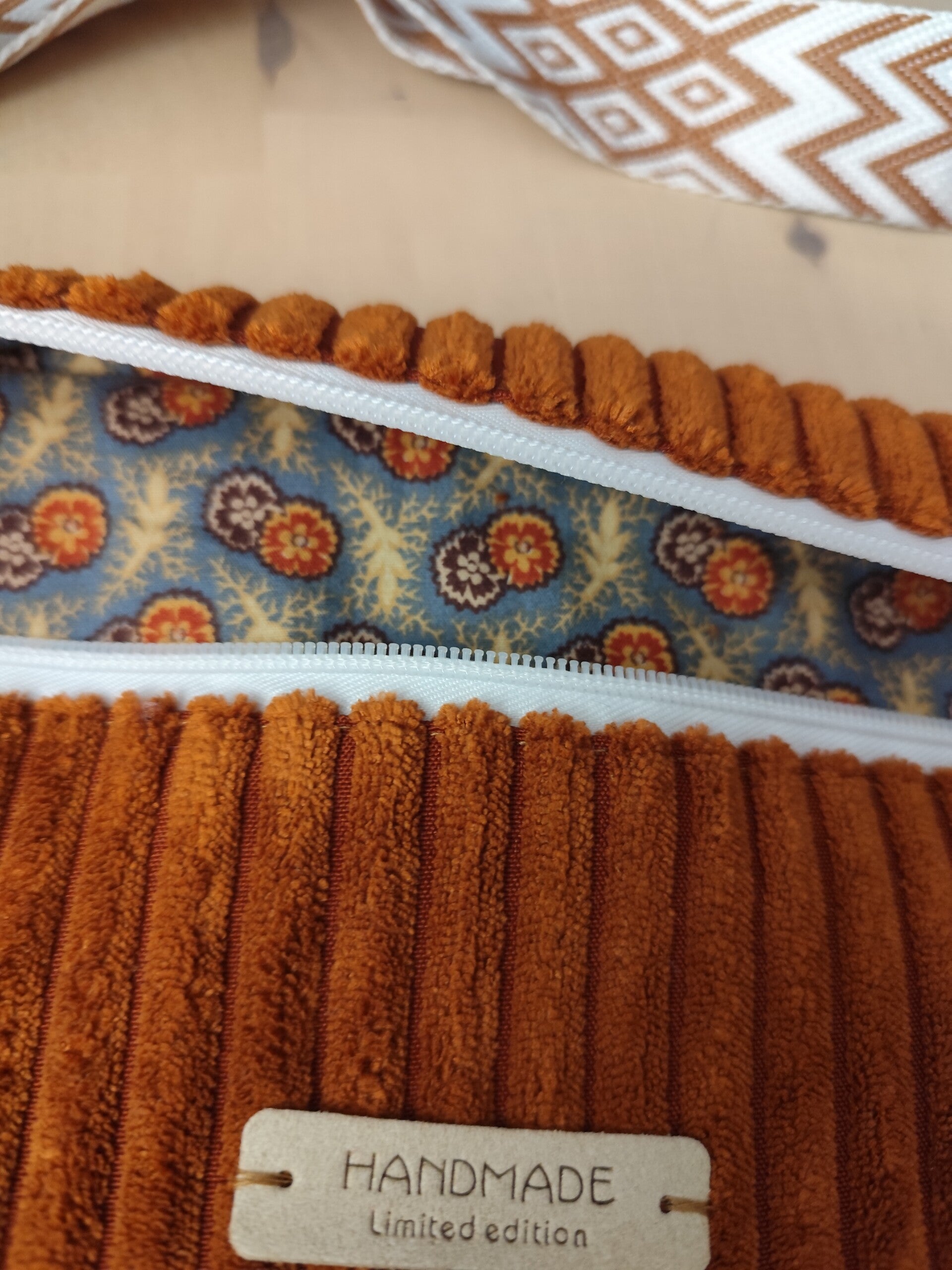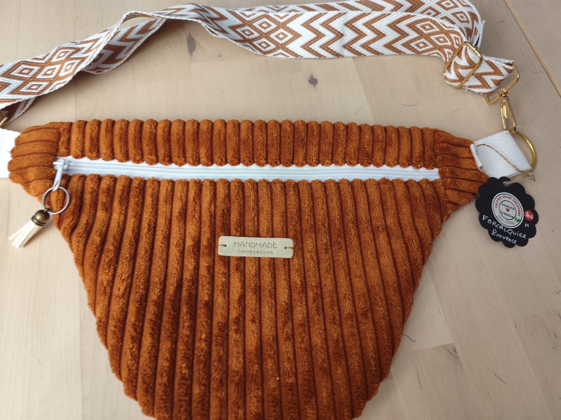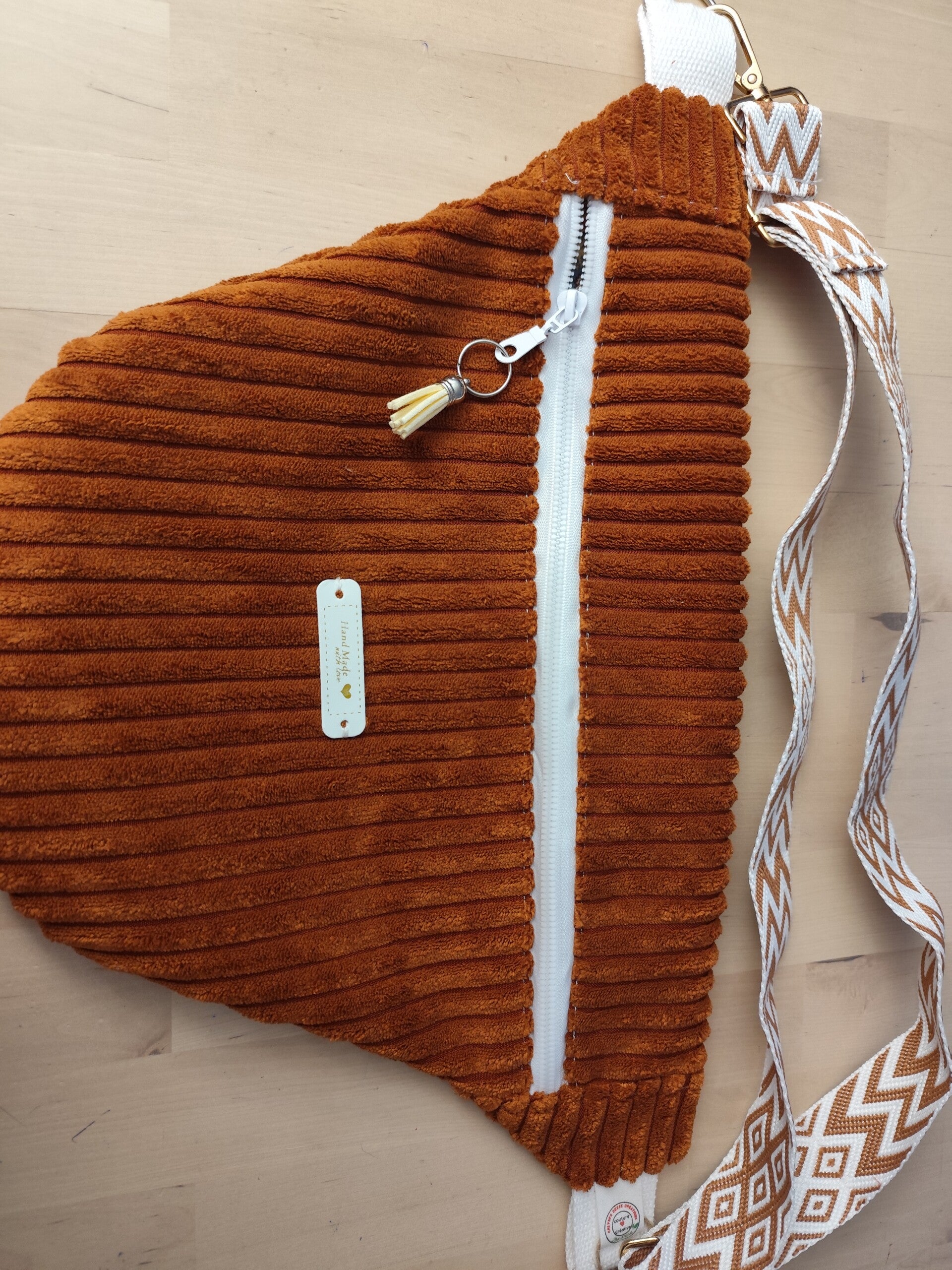 Magnifique sac en velours côtelé ocre doublé d'un coton imprimé oeko-tex il est vendu avec une jolie sangle.