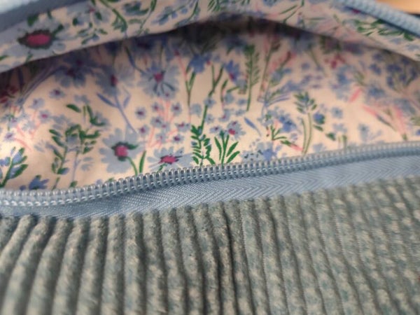 Magnifique sac en velours côtelé bleu devant et au dos et en jacquard français au dessus. Il est doublé d'un coton imprimé oeko-tex, et vendu avec une jolie sangle.