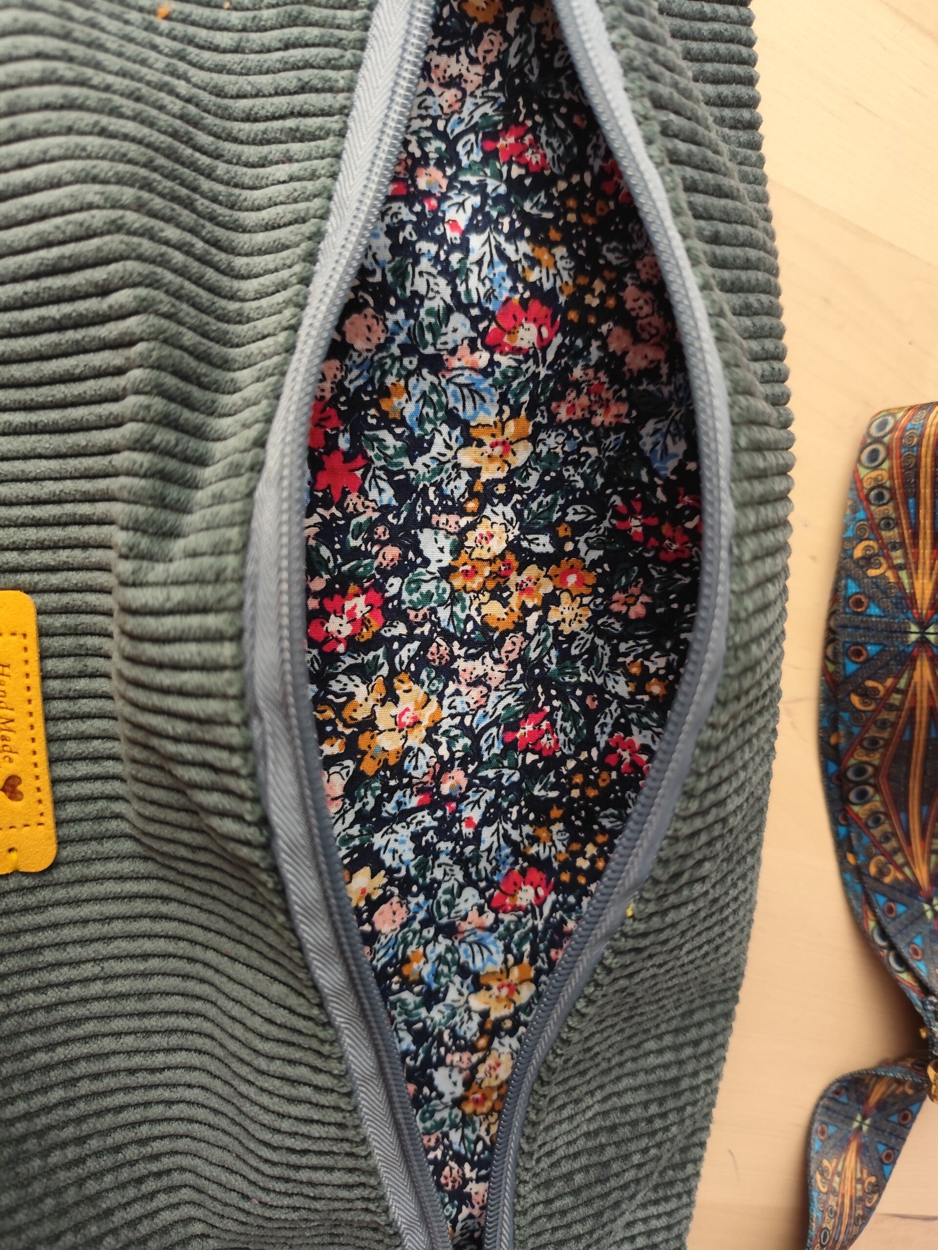Magnifique sac en velours côtelé vert et jaune doublé d'un coton imprimé oeko-tex, il est vendu avec une jolie sangle .