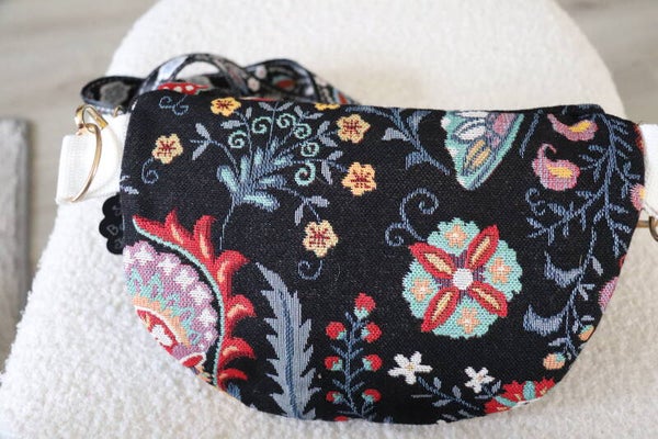 Magnifique sac Banane réalisé dans un tissu Jacquard motifs Fleurs et papillons.