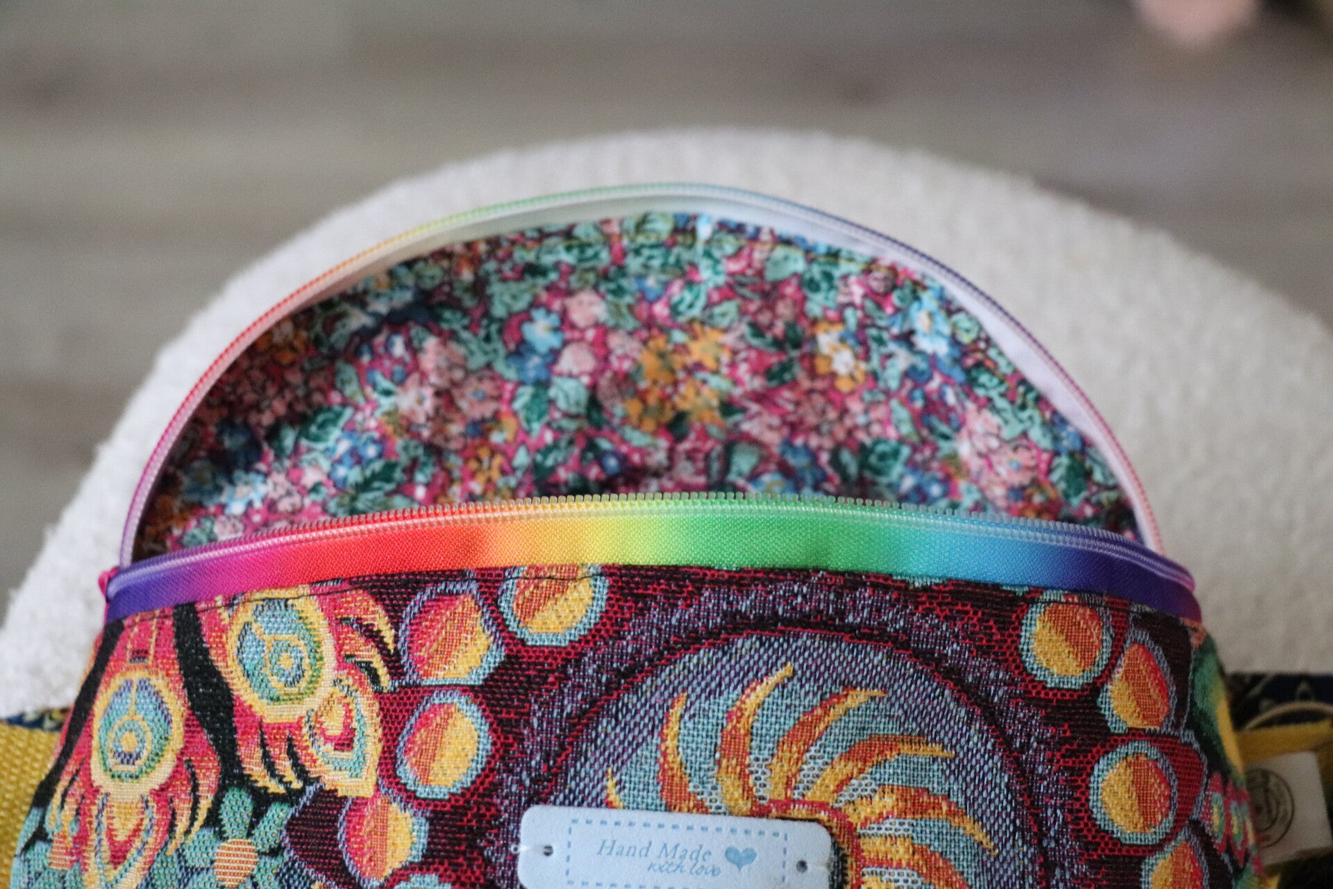 Magnifique sac Banane réalisé dans un tissu Jacquard motifs seventies trés colorés.
