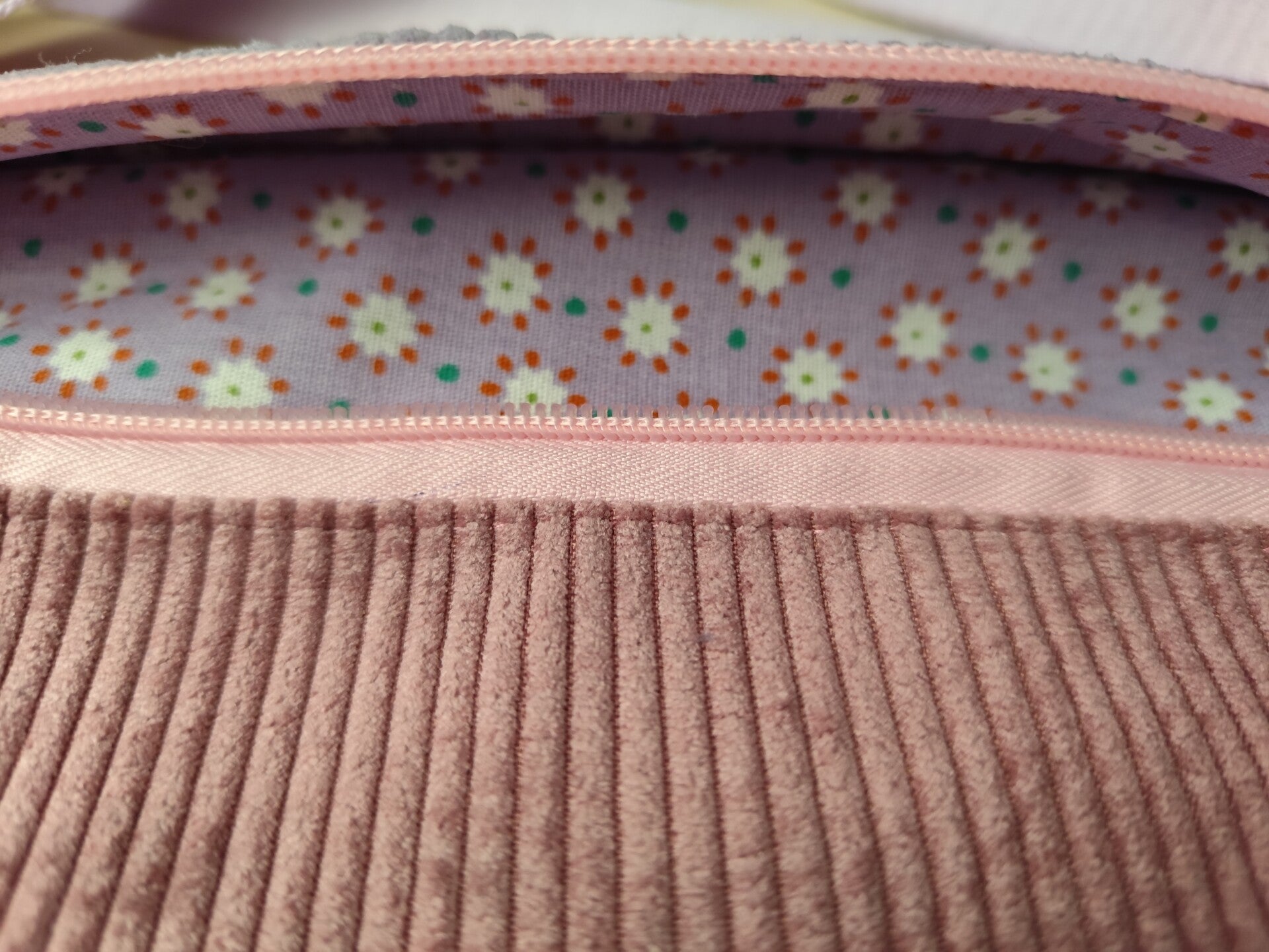 Magnifique sac en velours côtelé bicolore mauve au dessus et vieux rose devant et au dos, il est doublé d'un coton imprimé oeko-tex et vendu avec une jolie sangle.