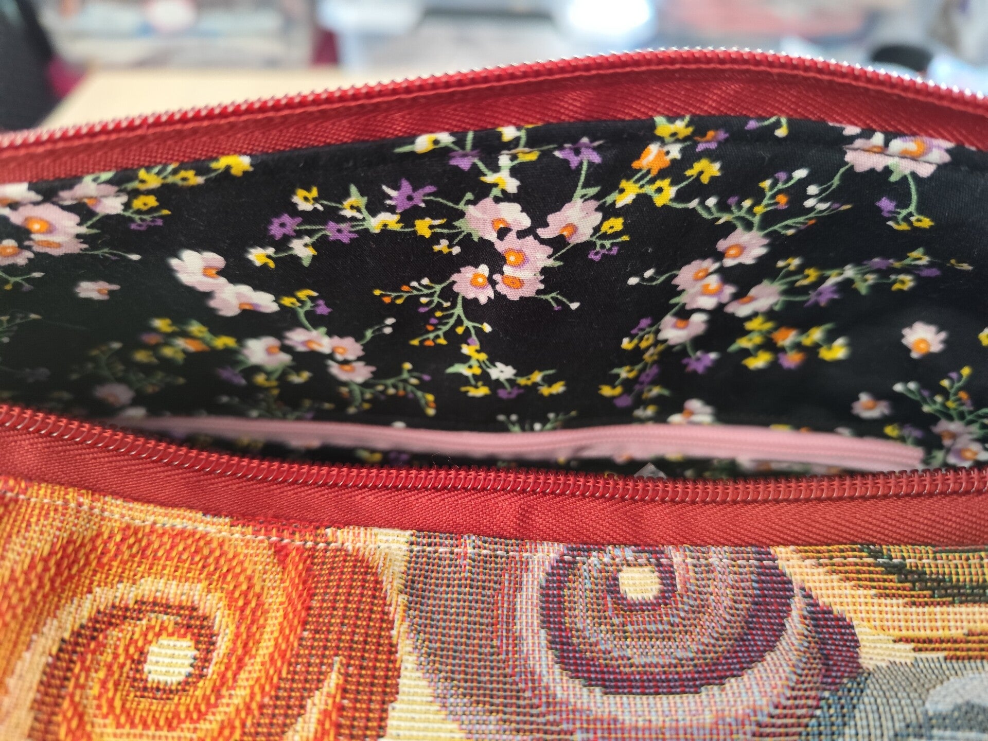 Il est doublé dans un coton imprimé fleuri, et possède une sangle verte et un Zip rouge .