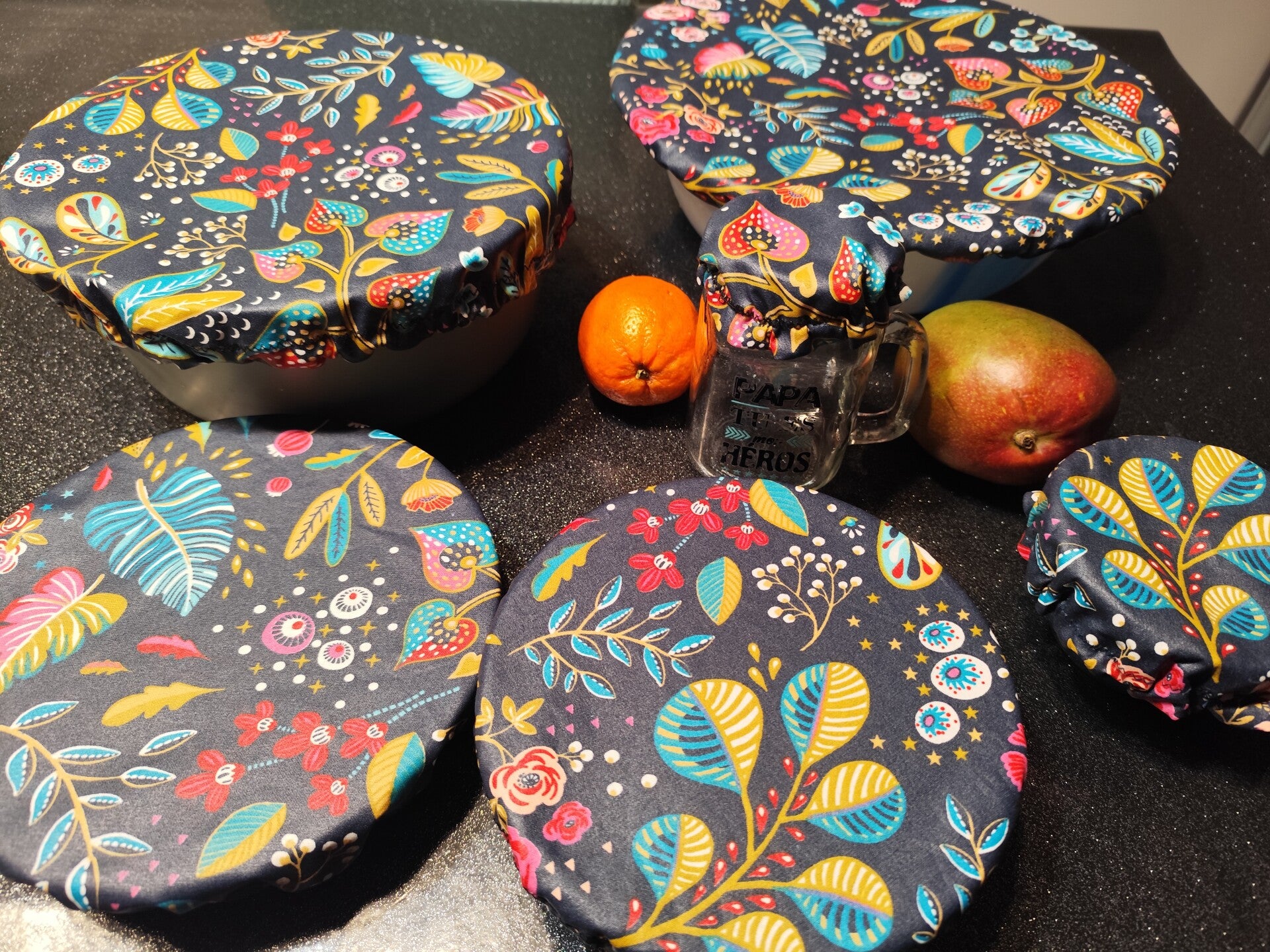 Jolies charlottes en coton enduit couleur noir à motifs floraux pour donner un air de fêtes à votre cuisine !