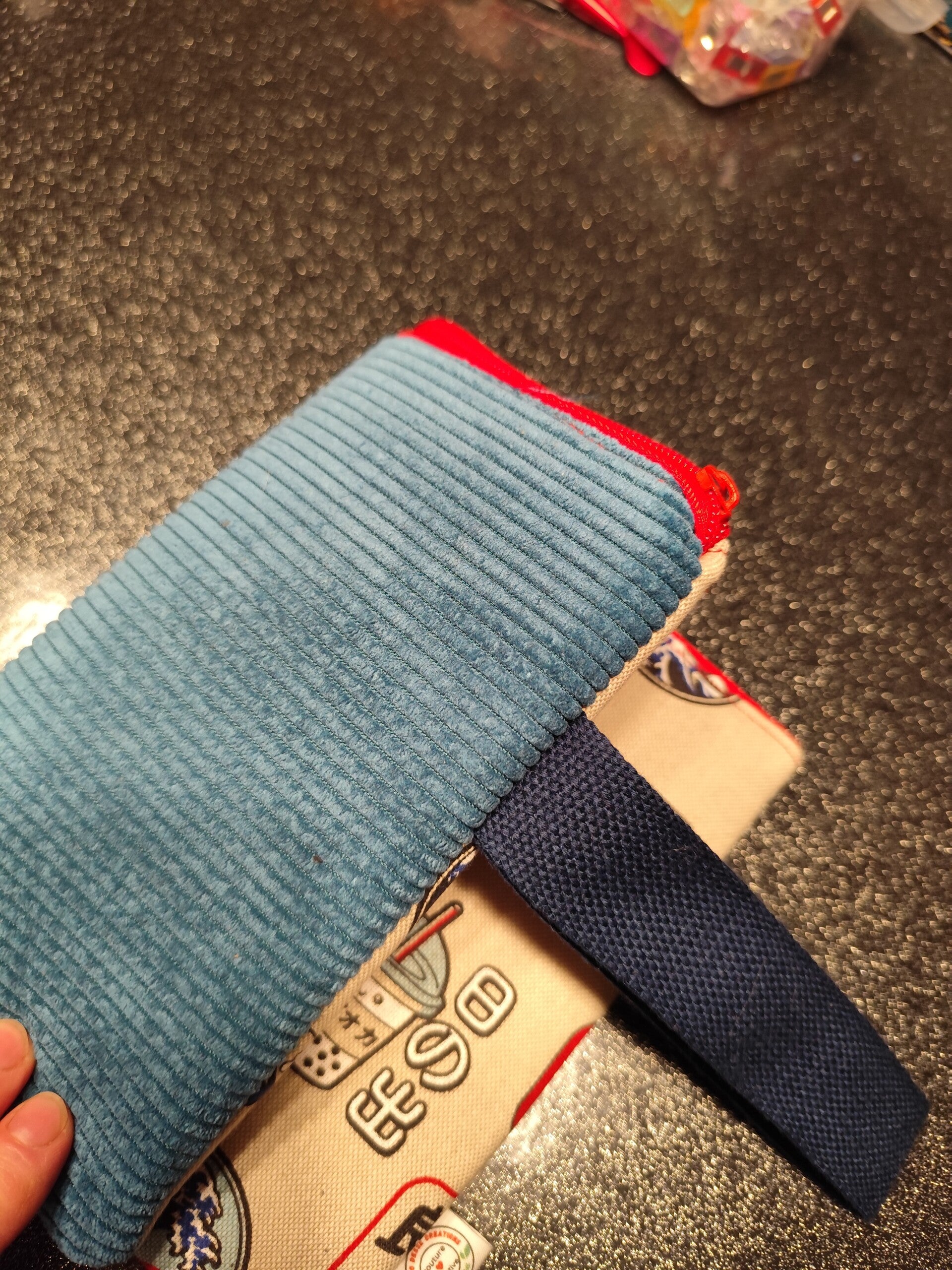 Cette jolie pochette est réalisée dans un coton épais style lin à l'imprimé japonais au recto et un velours côtelé bleu- vert au verso. Elle est doublée avec un coton uni rouge et possède une dragonne bleue marine et un zip Rouge.