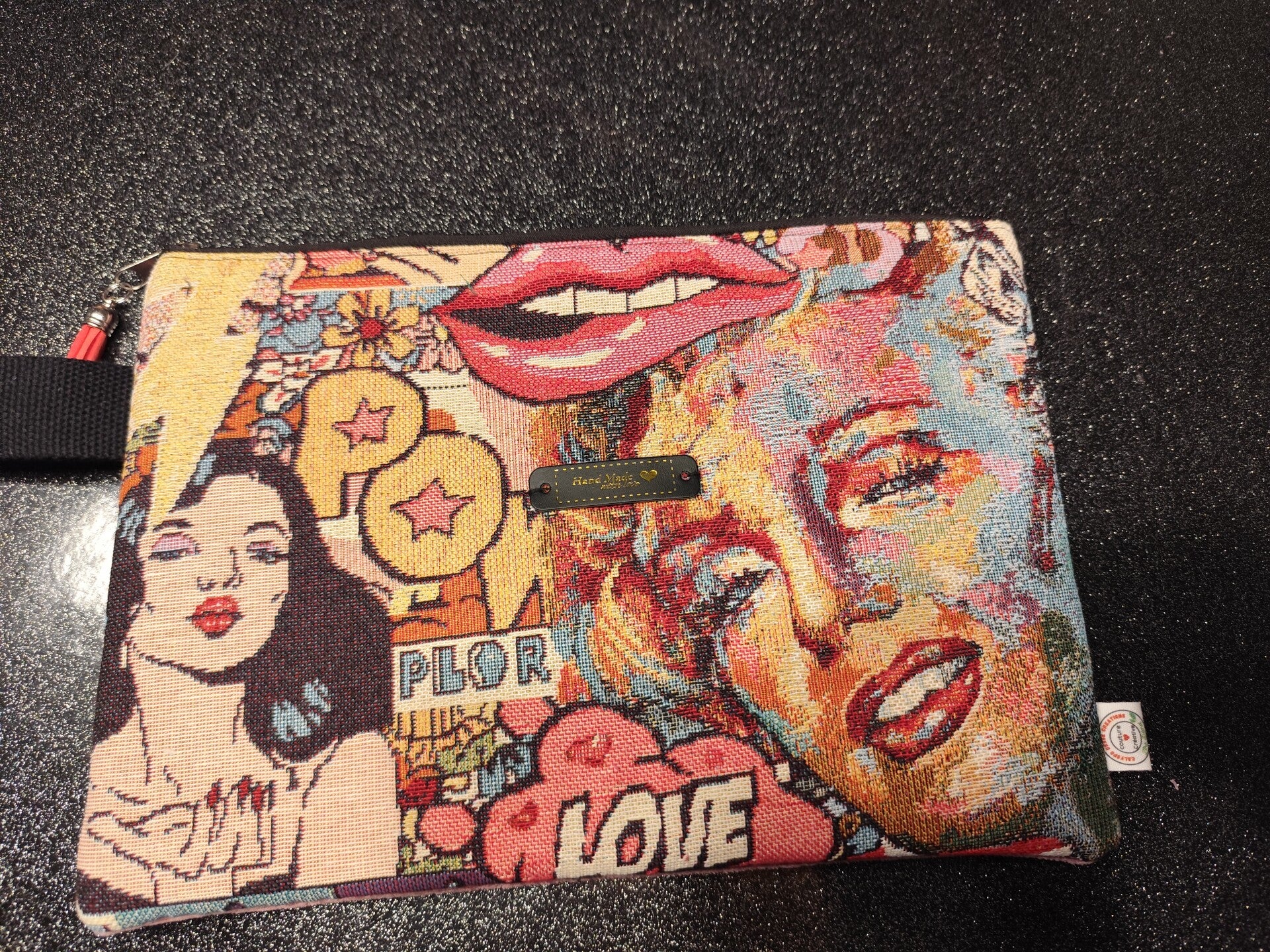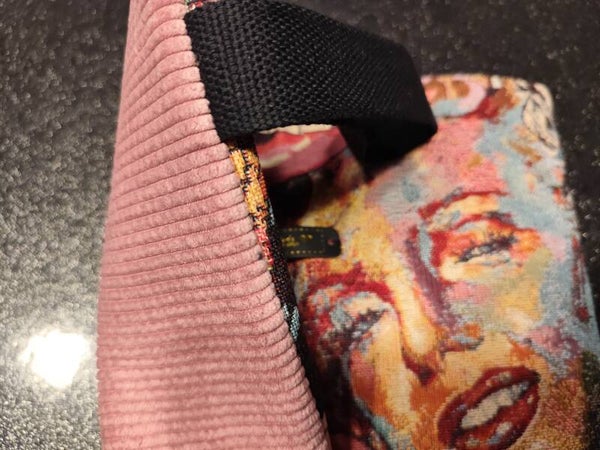 Cette jolie pochette est réalisée dans un jacquard français style Pop Art au recto et un velours côtelé vieux rose au verso. Elle est doublée avec un coton uni noir, elle a une dragonne et un zip de couleur noire.