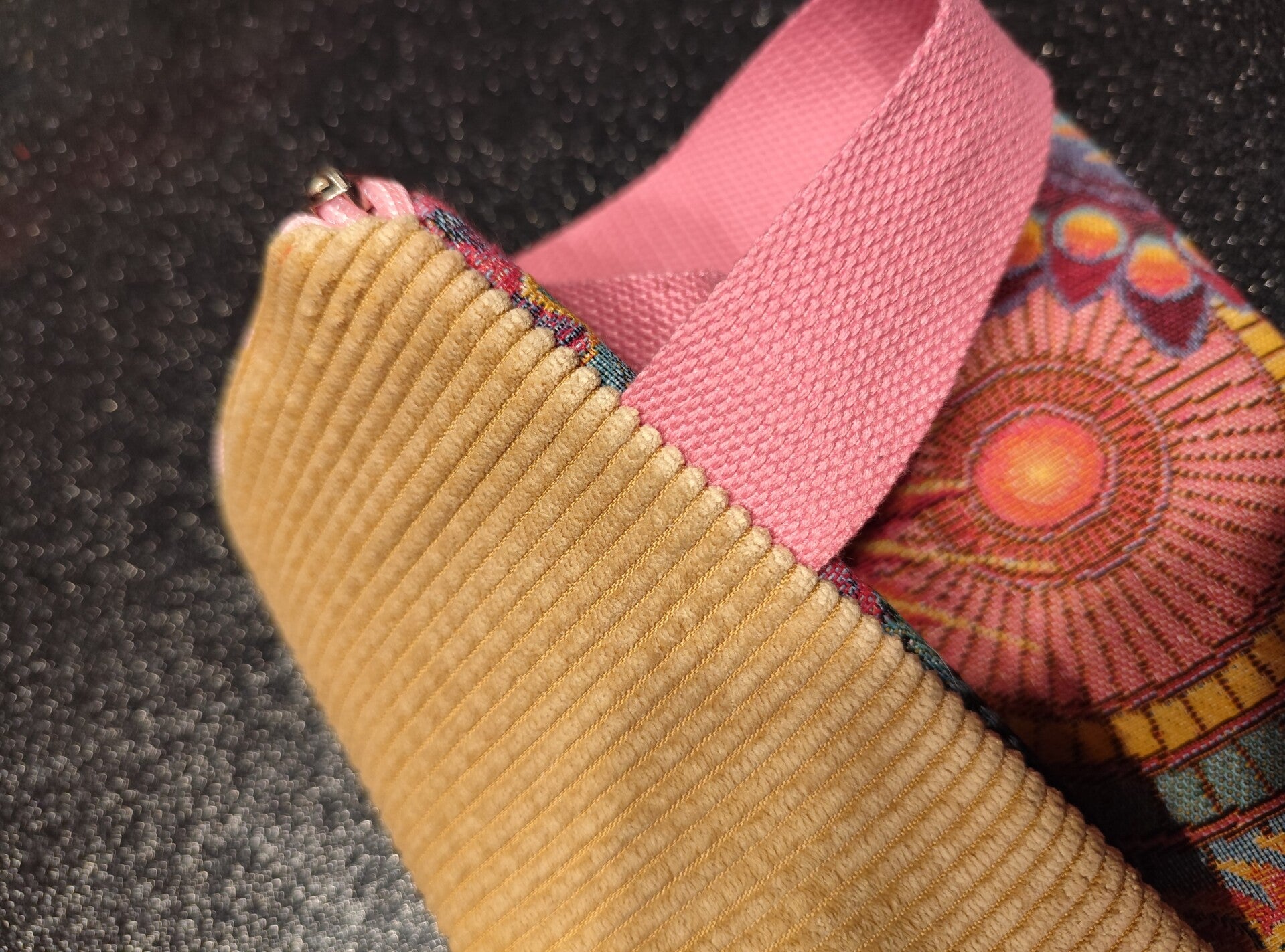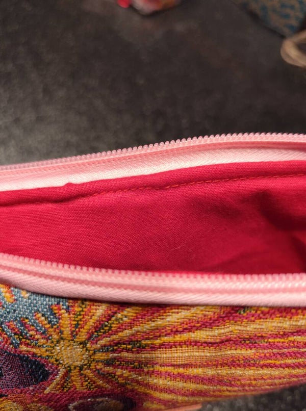 Cette jolie pochette est réalisée dans un jacquard français coloré au recto et un velours côtelé beige au verso. Elle est doublée avec un coton uni rouge, elle a une dragonne et un zip de couleur rose.