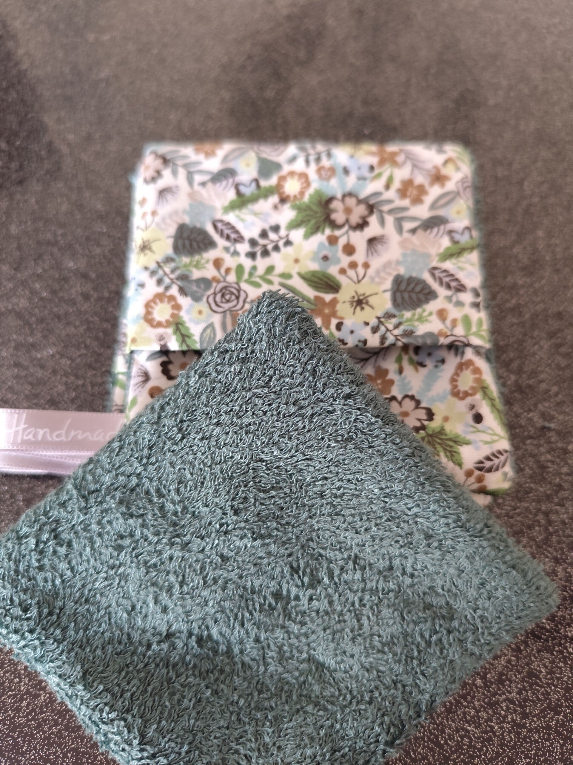 Trés joli tissu en coton imprimé , doublé d'une éponge de bambou couleur verte .