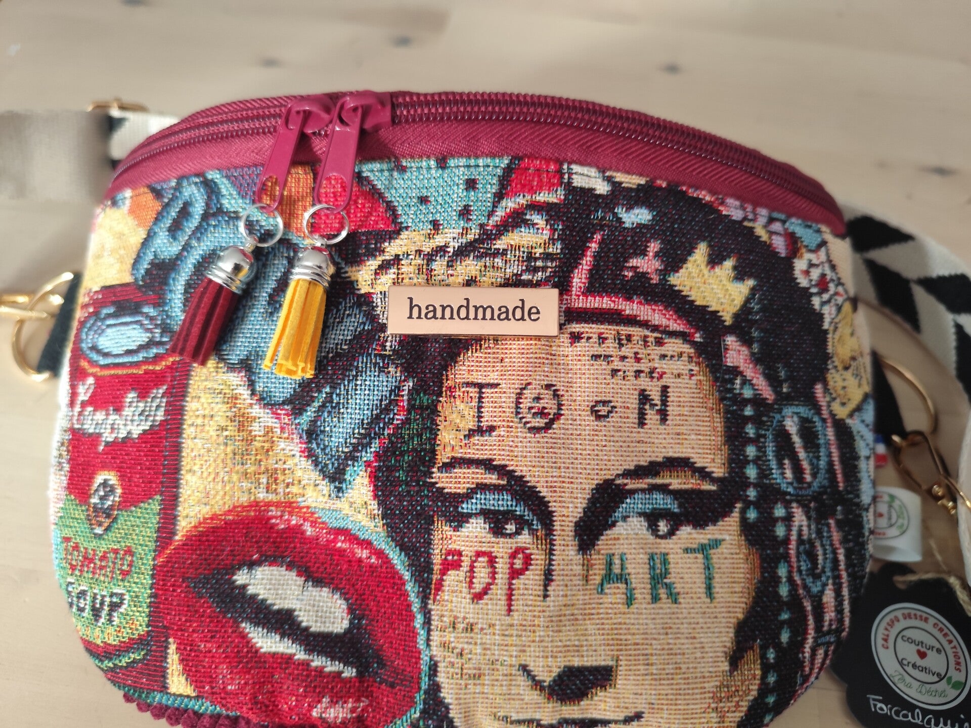 Magnifique sac Banane réalisé dans un tissu Jacquard pop Art Il est doublé et posséde une anse bicolore et des pompoms assortis accrochés aux curseurs de la fermeture éclair.