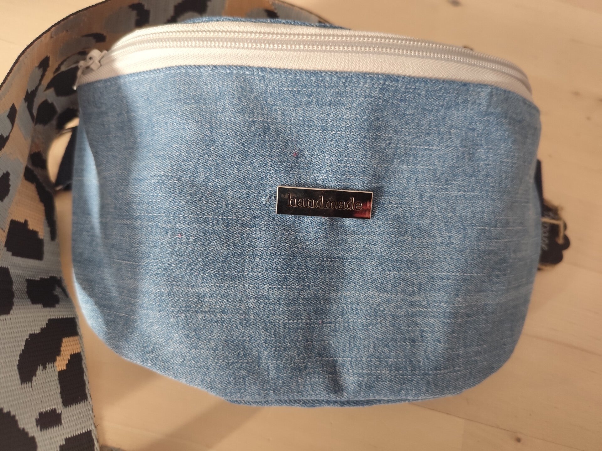 Magnifique sac Banane réalisé dans un tissu en jeans, Il est doublé dans un coton fleuri et posséde une anse léopard et des pompoms assortis accrochés aux curseurs de la fermeture éclair.