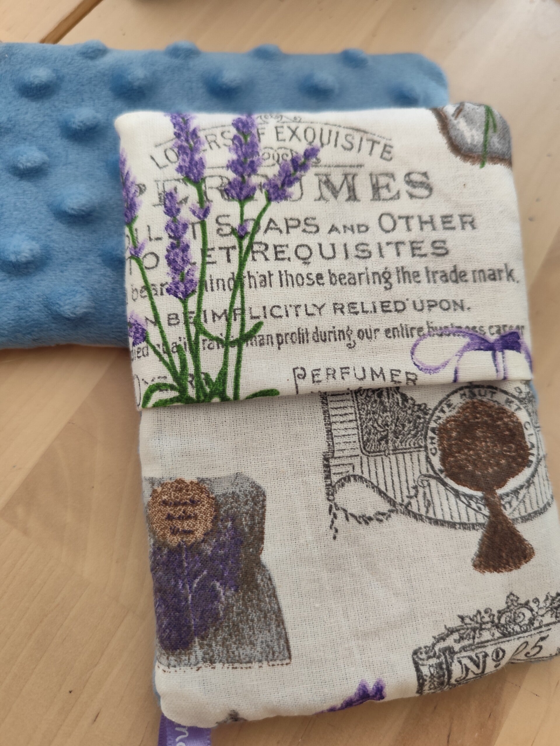 Gant magique fluffy réalisé dans un minky bleu et un joli tissu imprimé lavandes.