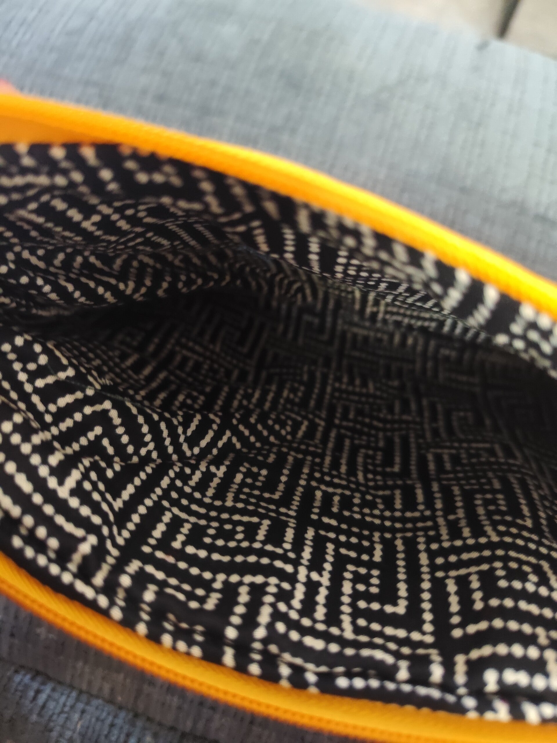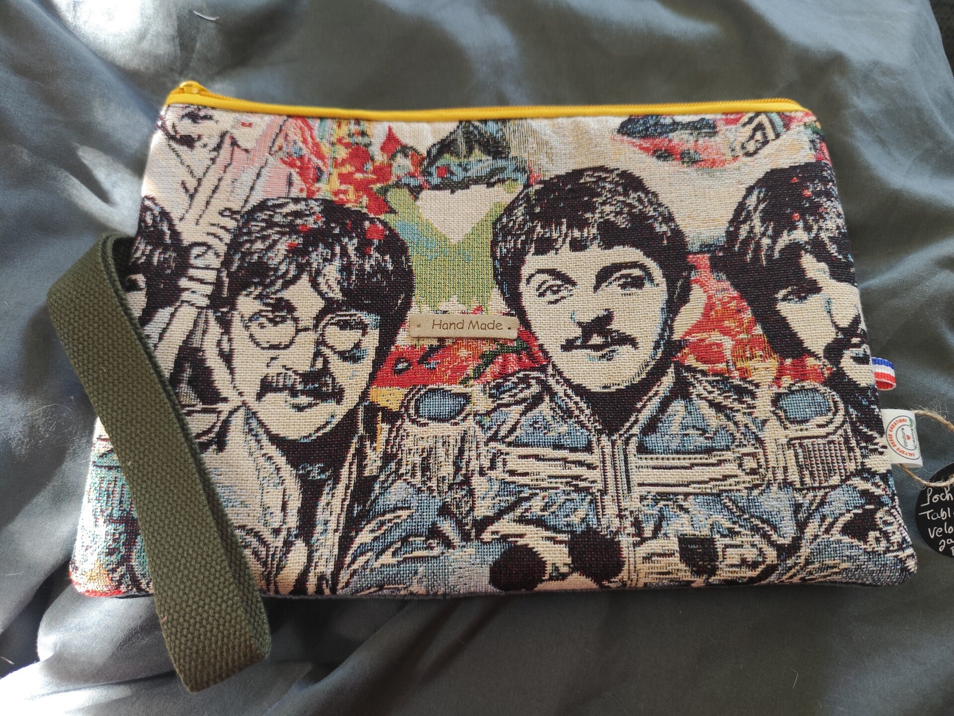 Cette jolie pochette est réalisée dans un jacquard français au recto et un velours côtelé vert au verso. Elle est doublée avec un coton imprimé noir, elle possède une dragonne verte et un zip jaune.