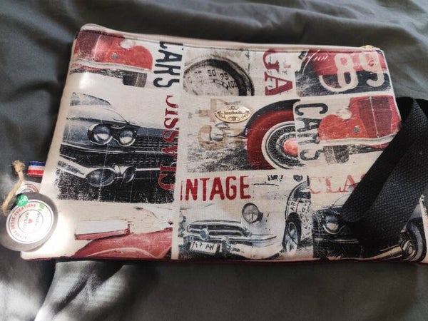 Cette jolie pochette est réalisée dans un coton épais style lin à l'imprimé au recto et un velours côtelé bordeaux au verso. Elle est doublée avec un coton imprimé noir, elle possède une dragonne noire et un zip noir ou beige.