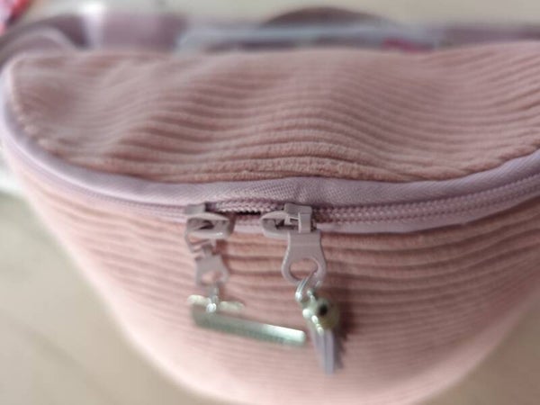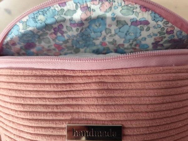 Jolie banane toute en en velours côtelé rose. Elle est doublé dans un coton imprimé.