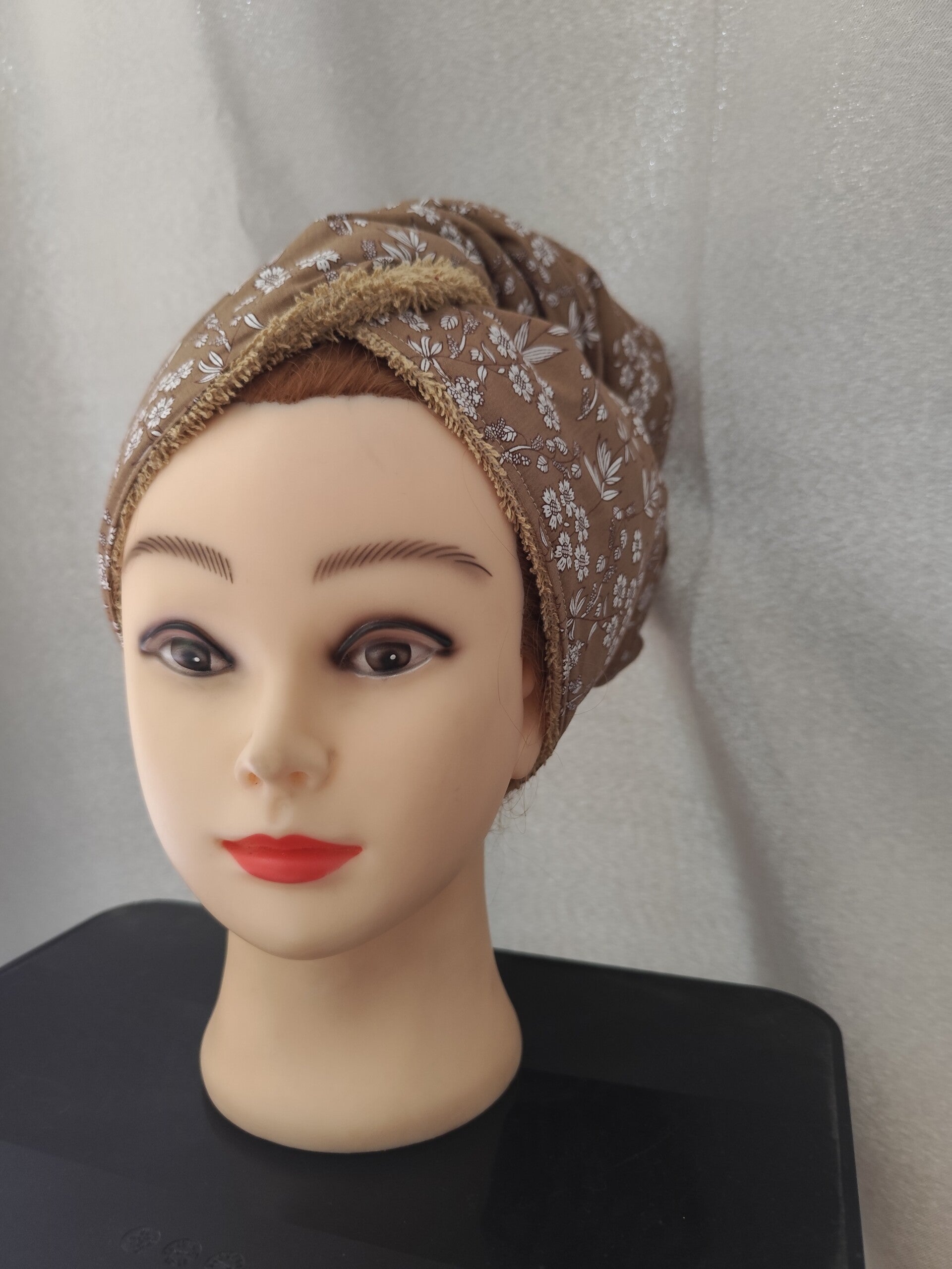 Très stylé, ce turban en coton imprimé, est doublé d'une éponge de coton de couleur beige, il vous accompagnera partout en toute élègance.