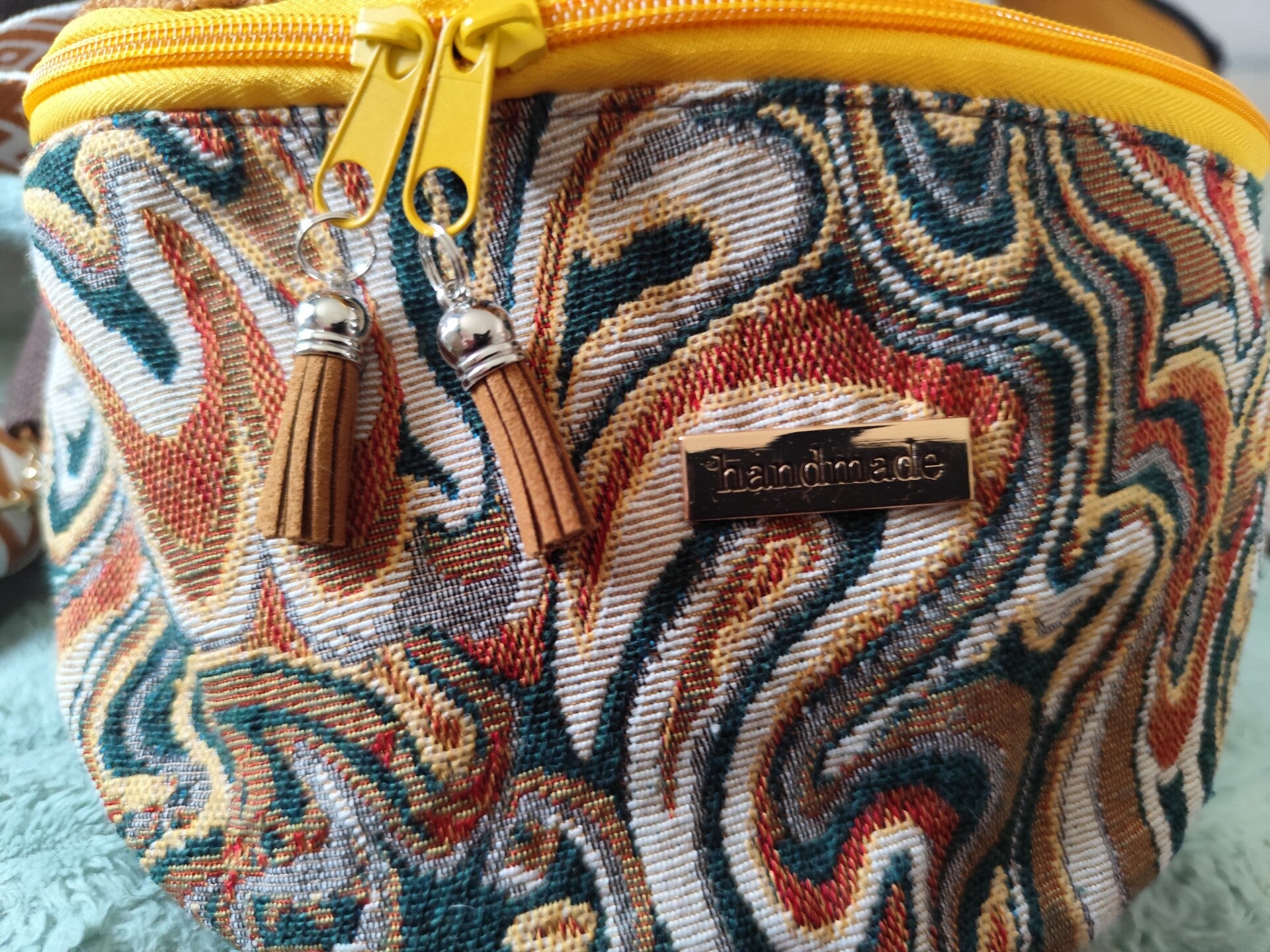 Il posséde une anse et des pompoms assortis accrochés aux curseurs de la fermeture éclair.