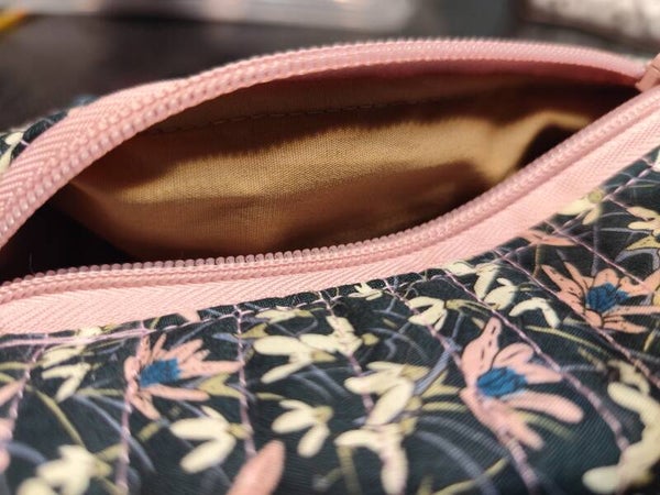 Jolie trousse fleurie matelassée , doublée d'un coton imprimé beige.