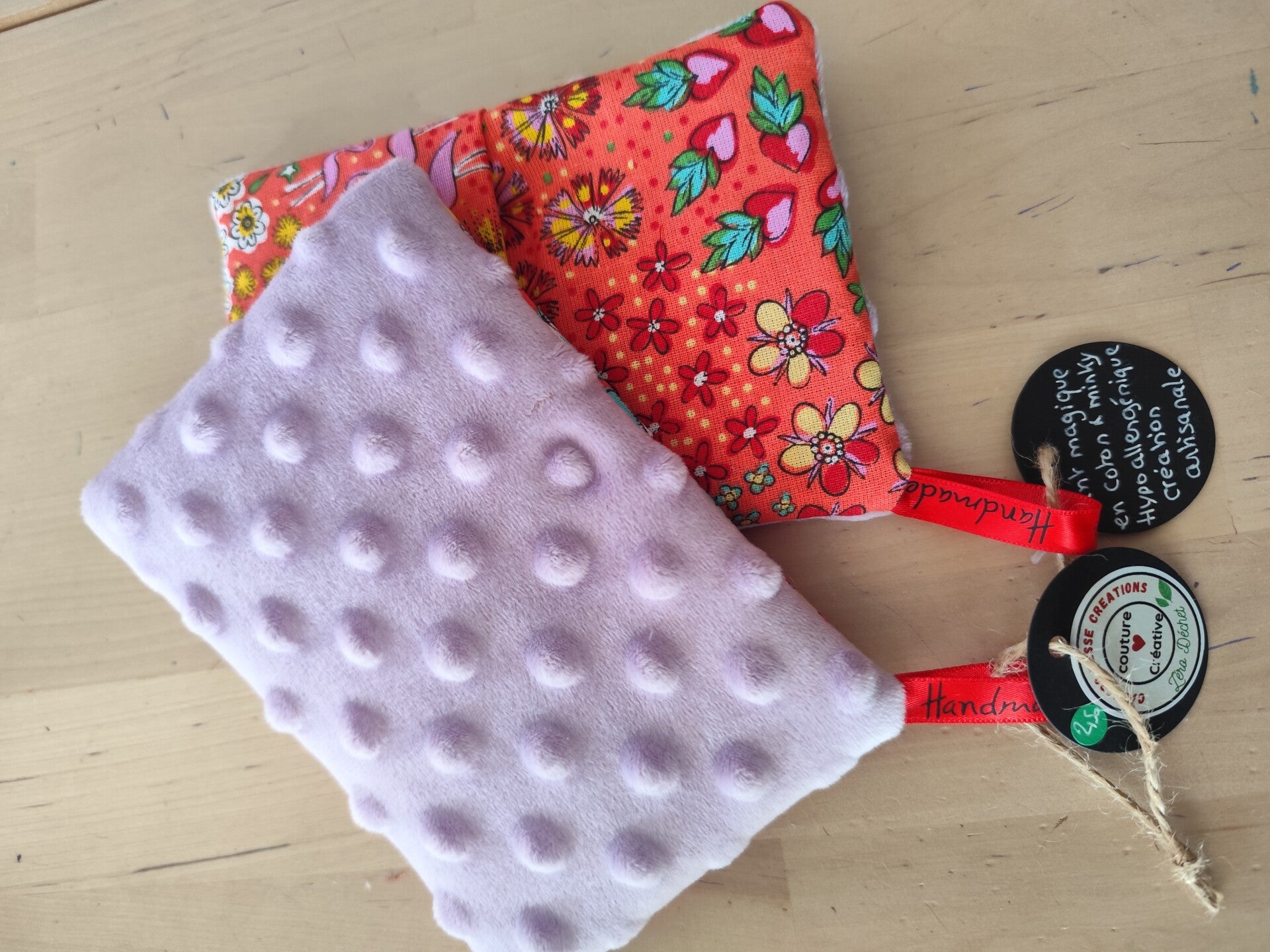 Gant magique fluffy réalisé dans un minky mauve et un joli tissu imprimé.