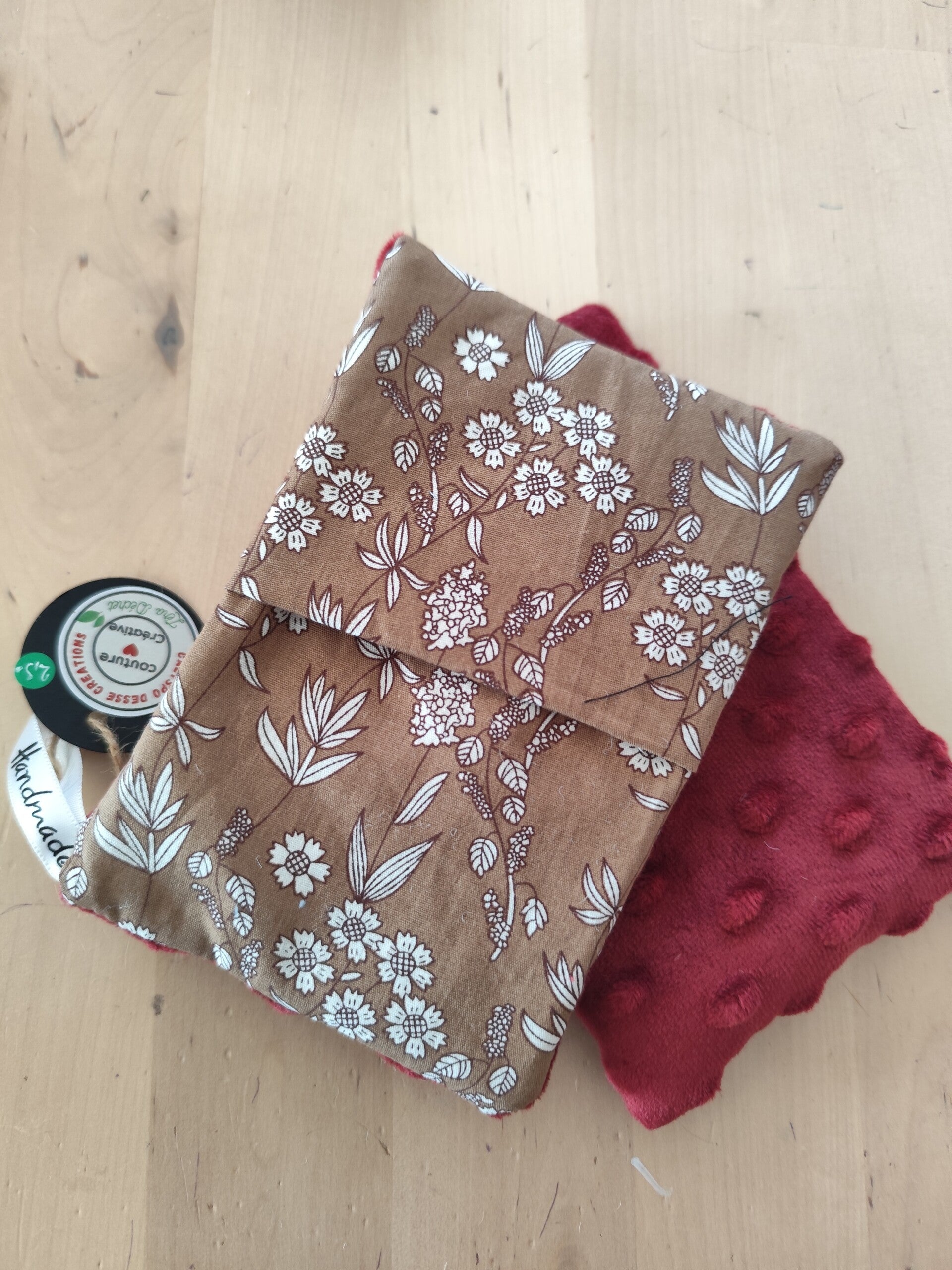 Gant magique fluffy réalisé dans un minky rouge bordeaux et un joli tissu imprimé.