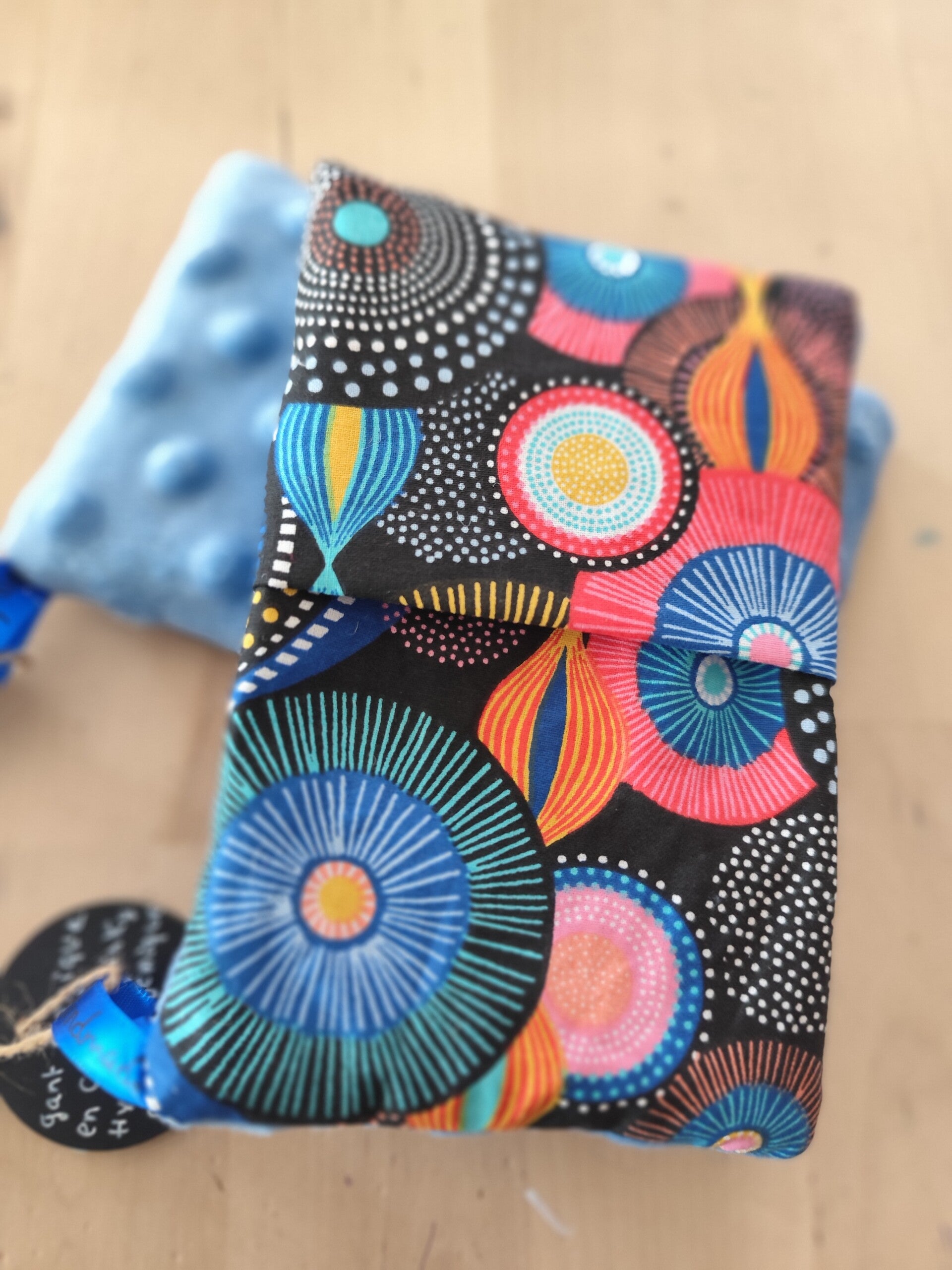 Gant magique fluffy réalisé dans un minky bleu et un joli tissu imprimé.