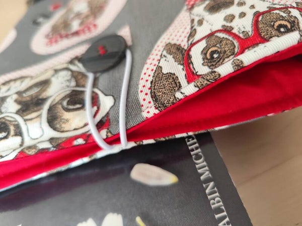 Composition : Tissu jacquard français et tissu uni en coton, rembourrage ouate en polyester, 1 bouton upcyclé et de l'élastique.