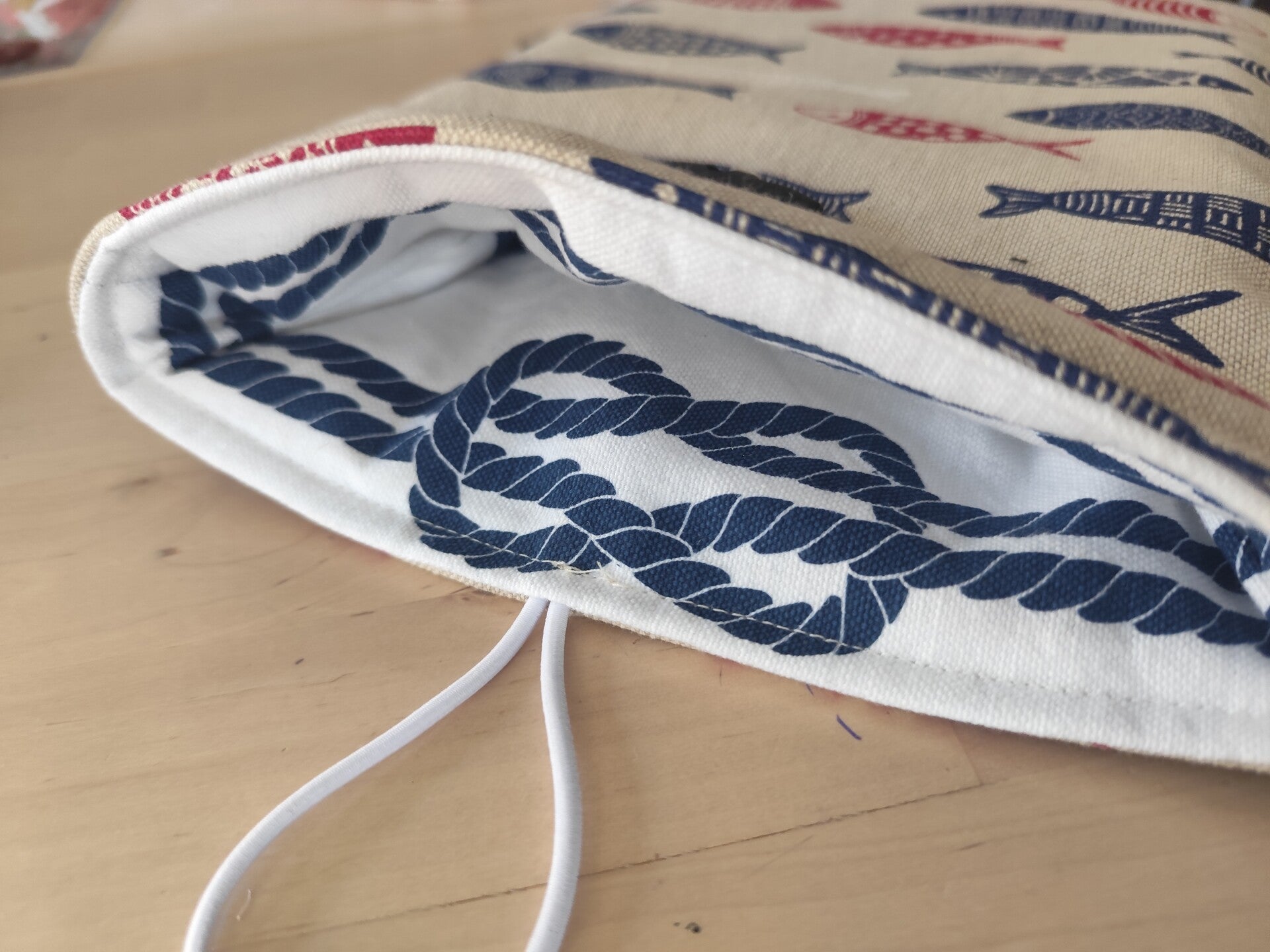 Cette jolie pochette est réalisée en tissu jacquard français doublée avec un coton motif noeud Marin et se ferme grace à un élastique et un bouton.
