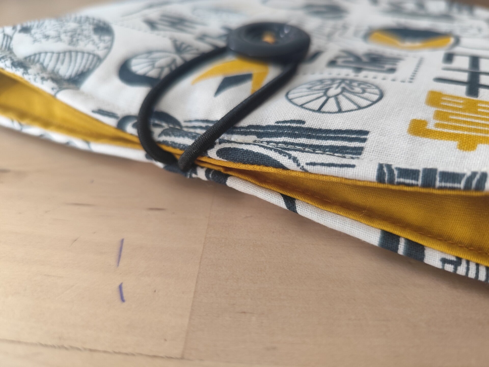 Cette jolie pochette est réalisée en tissu coton imprimé japonais doublée avec un coton uni et se ferme grace à un élastique et un bouton.