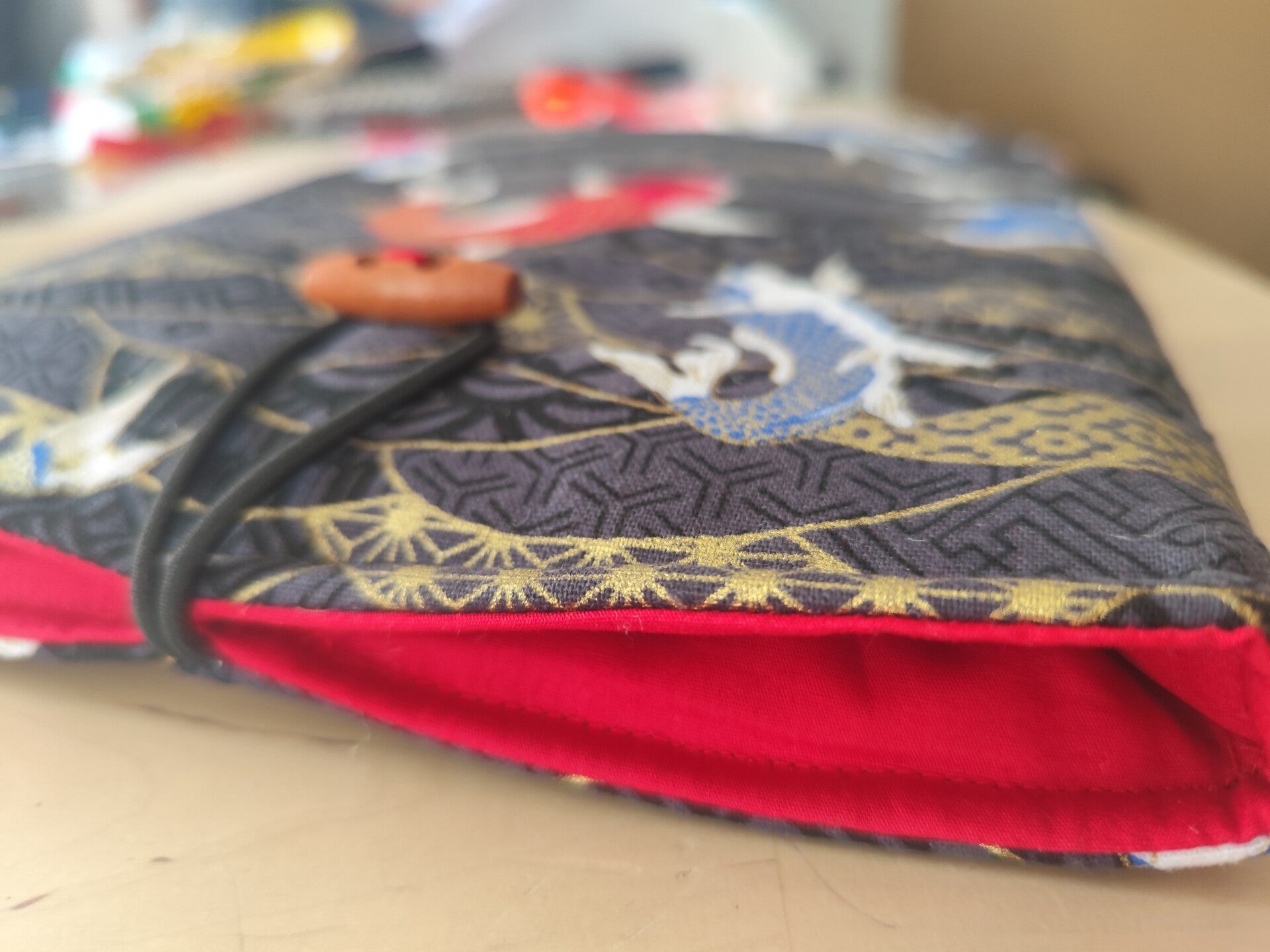 Composition : Tissu japonais et tissu uni en coton, rembourrage ouate en polyester, 1 bouton upcyclé et de l'élastique.