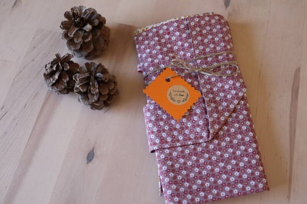 Joli sac à tarte réalisé dans un coton au motif de petites fleurs bordeaux, il est doublé dans un coton avec des petites fleurs jaunes. Stylé, il est indispensable pour transporter vos préparations culinaires hors de chez vous même les plus grands plats.