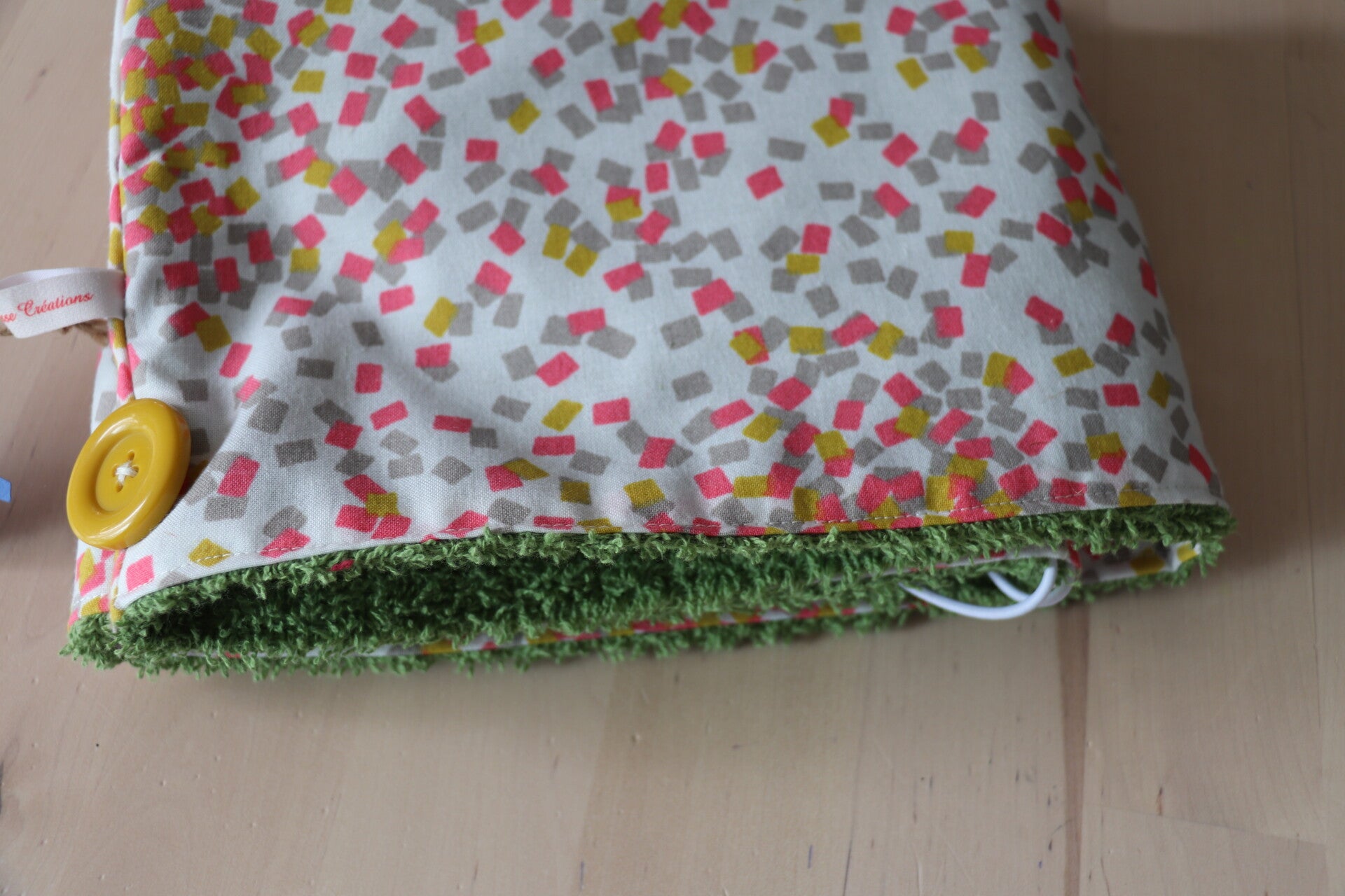 Composition : Eponge de coton et coton imprimé Oeko-tex standard 100, un élastique et un joli bouton vintage upcyclé.