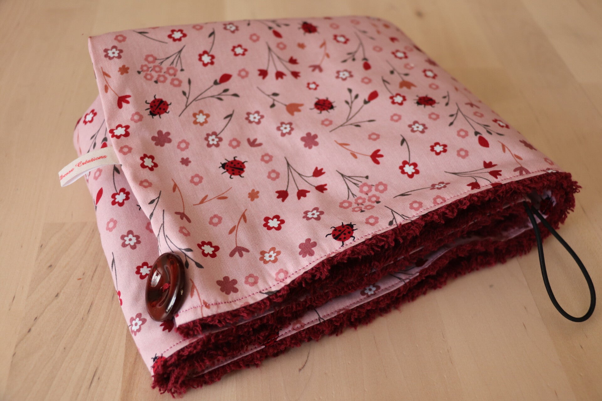 Très romantique, ce joli turban rose avec des coccinelles est doublé d'une éponge de coton de couleur bordeaux, il vous accompagnera partout tout en élègance.