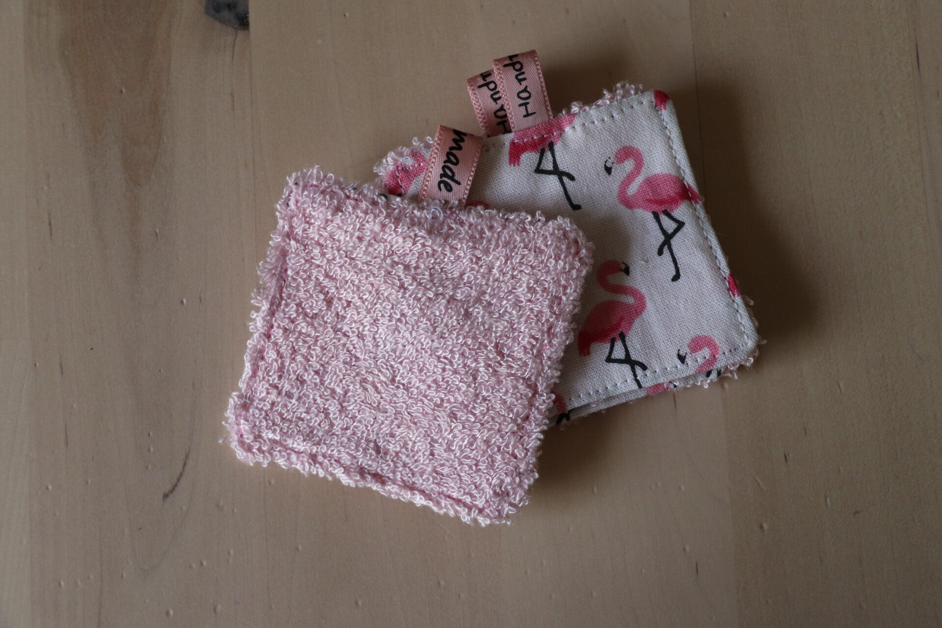 Joli coton blanc avec des flamands roses doublé d'une éponge de bambou rose.