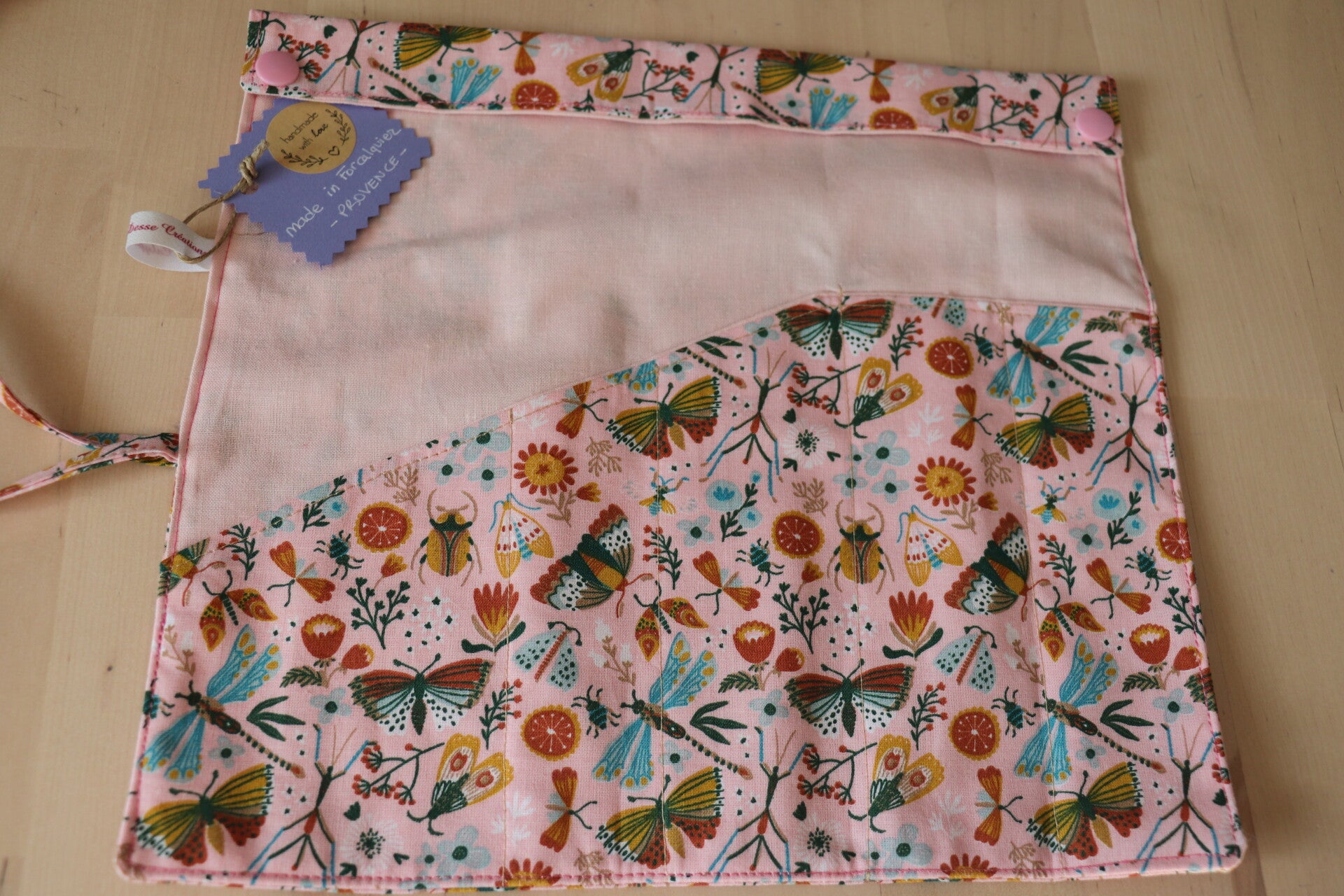 Trés joli tissu rose en coton Oeko-tex avec des insectes, doublé d'un coton uni rose pale.