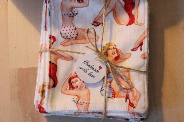 Très joli coton blanc avec des pin up doublé d'une micro-éponge de bambou blanche ultra douce.