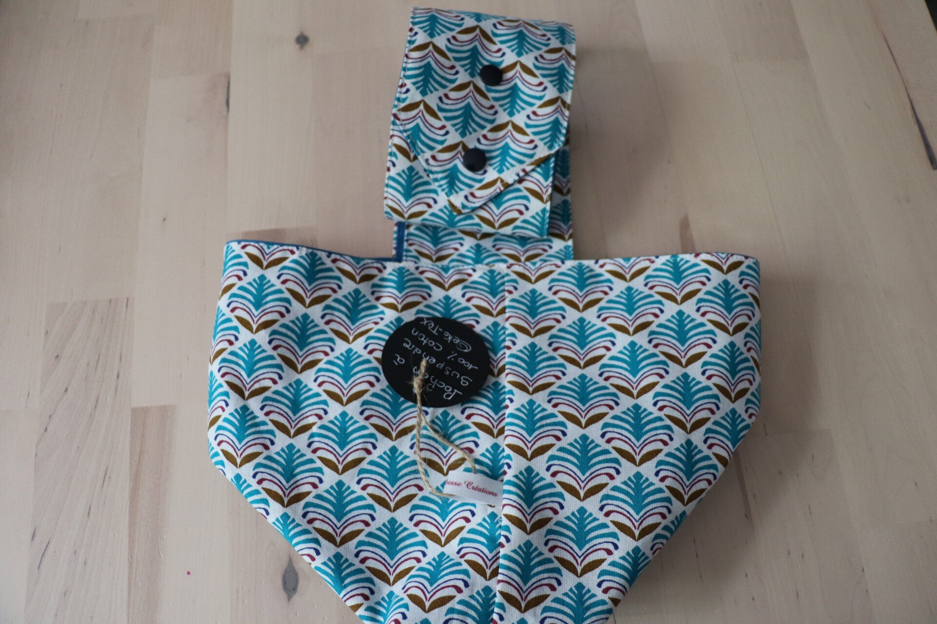 Il est composé d'un joli tissu graphique doublé d'un tissu uni vert. Il est réversible et se fixe facilement sur l'étendoir ou le radiateur de la salle de bains par 2 pressions.